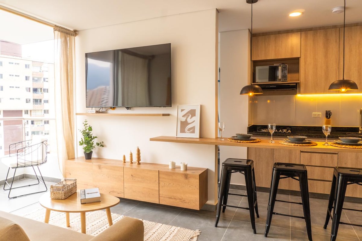 **IMPORTANT! READ HOUSE RULES FIRST** Stunning 20th-floor modern apartment with panoramic city skyline views. This 2-bed retreat sleeps 4 and features a private balcony, dedicated workspace, and fast Wi-Fi. Enjoy resort-style amenities including a rooftop jacuzzi, gym, and sauna. Perfectly located opposite the Viva Envigado shopping center for ultimate convenience. Ideal for families, couples, or business travelers seeking luxury and comfort.