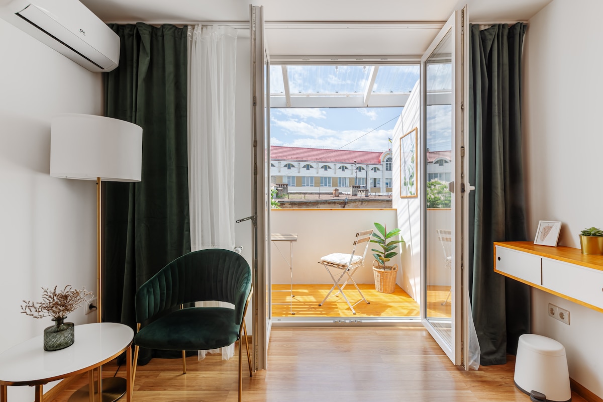 Jednosobni studio apartmani, 45 m2. Zasebna spavaća soba s bračnim krevetom, lođa. Studio s sklopivim dvostrukim kaučem i antiknim namještajem. Udobna kuhinja s novim kućanskim aparatima, priborom za jelo. Kupatilo s tuš kabinom i toplim podom. Apartmani se nalaze u historijskom dijelu grada između dva trga. 3-5 minuta hoda do pozorišta, muzeja, kafića, restorana, taksija. 8 minuta do željezničke stanice.