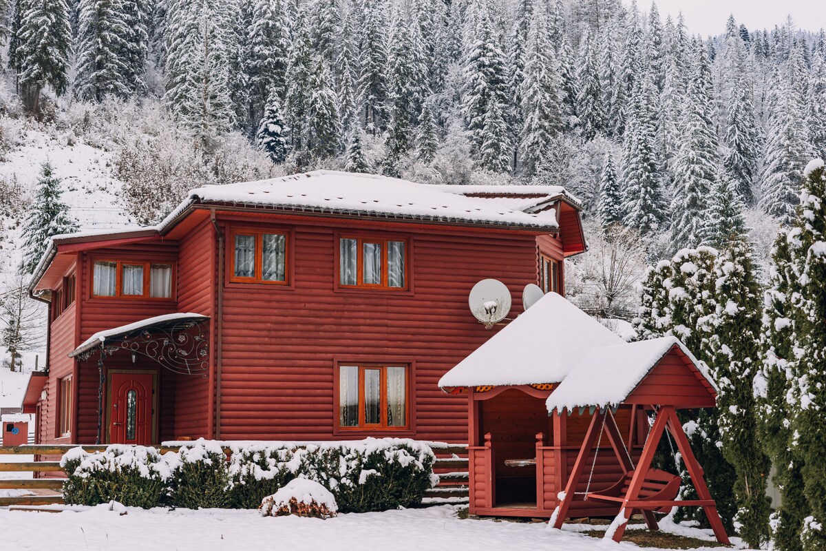 Nudimo kuću tipa A u obliku slova A u selu Kvasi, u blizini sanatorija „Mountain Tysa”(oko 1,8 km., Bukovel-35 km.,Dragobrat -10 km.). Usluge: velika ljetna terasa s roštiljem i udobnim namještajem,dvije spavaće sobe s 2 bračna kreveta, kao i radna kancelarija s sklopivim kaučem, 1 kupatilo s mašinom za pranje veša, kuhinja sa svom potrebnom opremom za kuhanje, prijemna soba s velikim kaminom i namještajem za opuštanje). Kod nas će vam biti udobno i udobno.