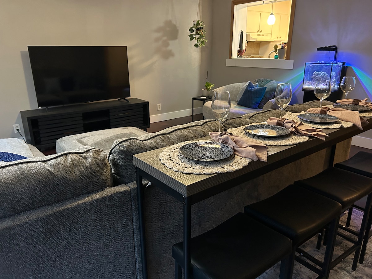 Doživite luksuz u našem sigurnom stanu 1BR/1BA prikladnom za kućne ljubimce, s podovima od mramora i tvrdog drveta, bračnim krevetom i brzim internetom. Moderna kuhinja, zajedno s aparatima od nehrđajućeg čelika i granitnim radnim površinama, savršena je za domaće obroke. Uživajte u zajedničkom pristupu bazenu, posebnom parkingu, praonici rublja i privatnom balkonu. Uz centralni zrak i Roku Smart TV, udobnost zadovoljava praktičnost u srcu grada. Mali kućni ljubimci su dozvoljeni uz naknadu za kućne ljubimce u iznosu od 200 USD