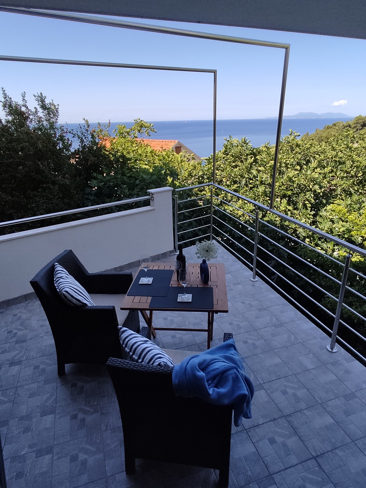 Apartman površine 60 m 2 sastoji se od spavaće sobe sa velikim bračnim krevetom, kupatila, prostranog dnevnog boravka sa kuhinjom, hodnika i balkona. Cijeli južni zid okrenut prema moru je u staklu, tako da prostor ima puno svjetla i čini jedan prostor s balkonom. Apartman se nalazi na trećem spratu kuće, koji se nalazi u blizini centra grada (5 minuta ugodne šetnje uz more) i sa balkona ima otvoren pogled na more i otoke budući da se kuća nalazi u prvom redu do mora.