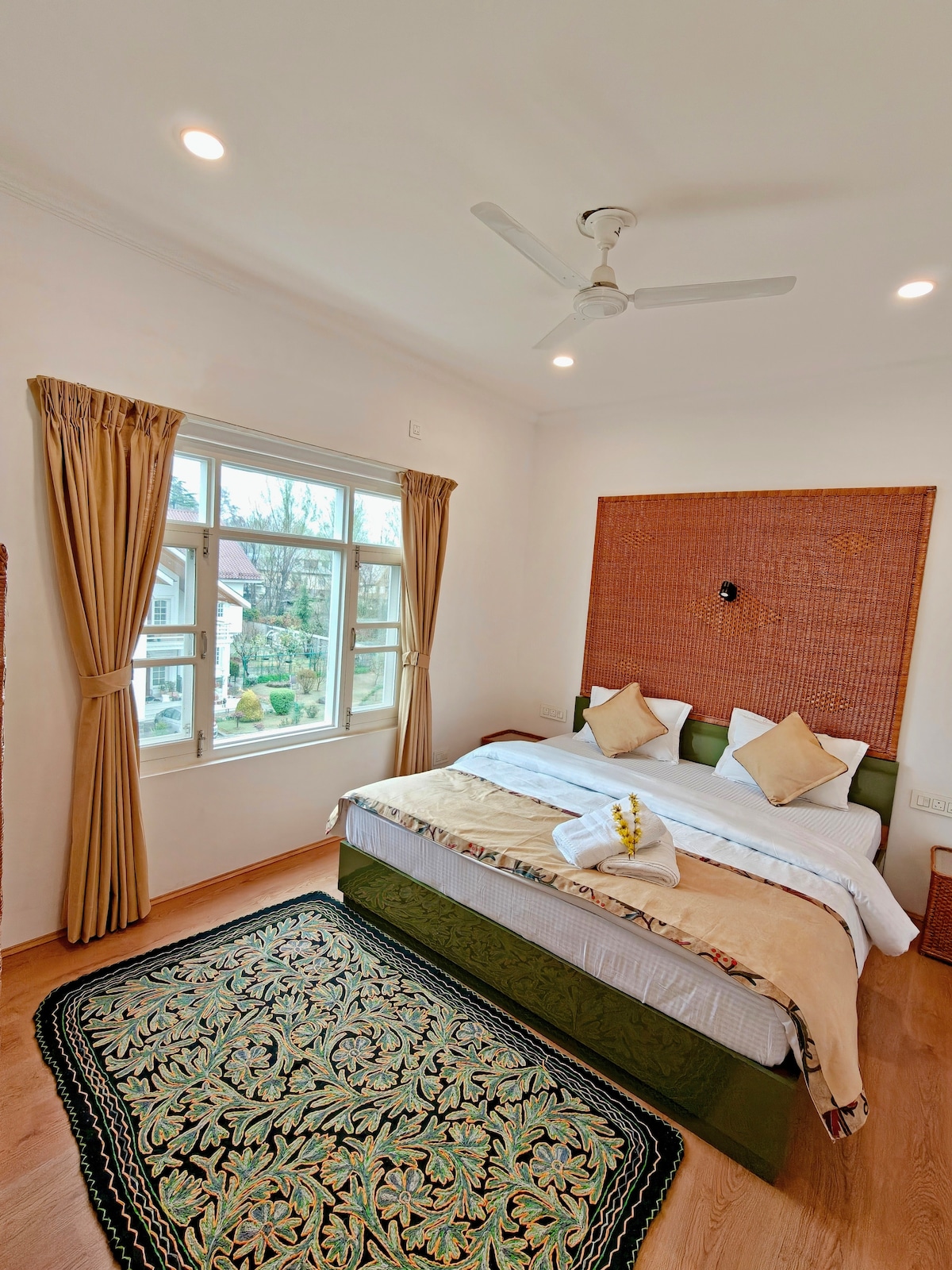 A 2BHK by Maskan, built around authentic Kashmiri willow wicker and Namda carpets — the same crafts from the old workshops of the Valley, now woven into your walls and floors. Good beds, hot water, fast wifi. Feels like a home, just one with a lot more character. Ideal for families and long stays. ★ LOCATION ★ ✔ 10 min from Lal Chowk & Airport ✔ 15–20 min to Dal Lake ✔ Day trips to Gulmarg, Pahalgam & Sonamarg ★ NEARBY ★ ✔ 5 min walk to Pick & Choose Supermarket ✔ 2 min walk to Nirman Complex