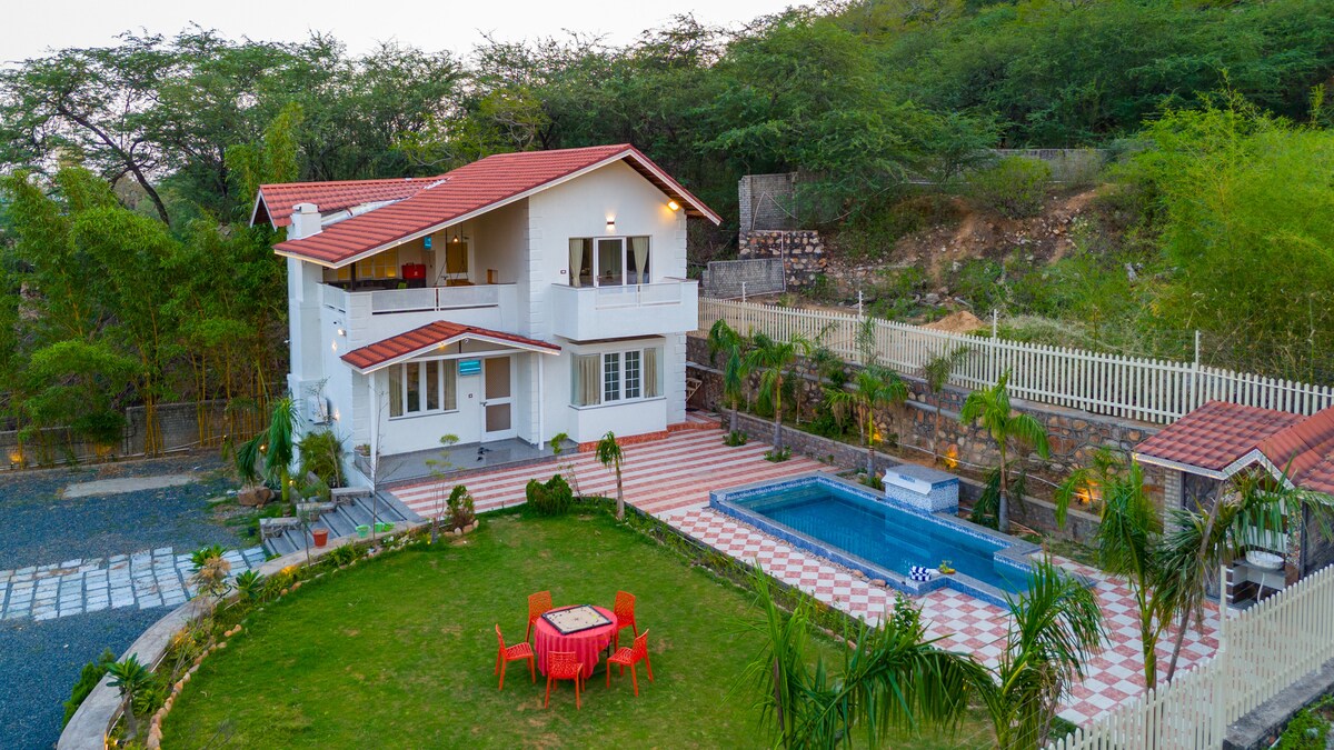 • <b> Luxury Aravalli Villa </b>: 15,000 sq ft, 3BHK, pet-friendly, private swimming pool & Jacuzzi. • <b> March Edit</b>: Exclusive Happy Holi Infusions from the House of Togo • <b> Complimentary</b>: Welcome Basket • <b> Gourmet Kitchen</b>: Fully equipped with Oven, and chef (on call). Zomato/Swiggy delivery available. • <b> Entertainment</b>: 4,000 sq ft lawn, pool table, indoor/outdoor games, 75" Smart TV. • <b> Full-Service</b>: 24/7 caretaker, chef available, parking for 5 cars.