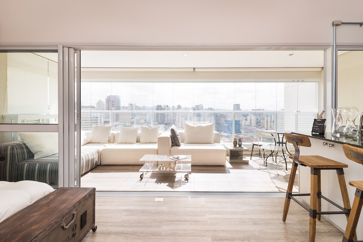 Estúdio espaçoso com muito design, arquitetura e a melhor vista de São Paulo. Loft completo! Com cama queen, closet, ar condicionado silencioso, cozinha completa, home office, WI-FI, TV 55” e uma belíssima banheira de imersão, de onde pode apreciar o seu drink preferido e curtir uma vista apaixonante. São Paulo toda estará há poucos minutos de você. Acesse o metrô andando apenas 200m. Reserve com tranquilidade! Proporcionaremos uma excelente hospedagem e uma ótima experiência!