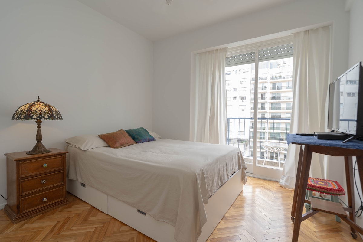 Wake up with the beautiful green view of the trees in the background, in this warm and comfortable apartment in the lively neighborhood of Palermo, surrounded by museums, shops, supermarkets and plenty of nice restaurants/bars to have a drink at sunset...With an unbeatable location it is an excellent starting point to visit the different neighborhoods of Buenos Aires. Building with security 24h/day. Internet speed 100 Mbps The apartment is cleaned with extra precautions and sanitized thoroughly. Apartamento de 50 m2 con vista verde, con balcón, en el corazón de Palermo. Tiene 1 dormitorio con cama matrimonial y 1 sillón cama de 1 plaza en el living. Black out en dormitorio y living. Posee caja de seguridad. Excelente ducha. Equipado con Internet Wi-Fi, posee 2 TV : una de 42" en el living y otra de 32" en la habitación con Netflix, 2 aires acondicionados, calefacción, microondas, tostadora, 1 gran heladera, cafetera y termo eléctrico, tender extensible para el secado de la ropa, plancha y tabla de planchar. El departamento ha sido reformado en mayo 2016, esto incluye pisos nuevos, colchón nuevo de alta calidad así como ropa blanca. En diciembre 2016 se colocó una cocina nueva, eléctrica. Me encuentro disponible en el celular para cualquier solicitud, consulta o recomendaciones sobre la ciudad de Buenos Aires o sobre el departamento. Apartment located in a safe and lively area, with a fantastic location that includes green spaces and an important gastronomic and cultural center very much appreciated of the city. Near the main cultural and touristic attractions. Steps from all means of public transport. Walking distance to Malba Museum. Only 10' from the Jorge Newbery National Airport. Ubicación muy práctica para moverse en BA con todos los medios de transporte públicos a 3 cuadras en Av.Las Heras y a 1 cuadra en Av.Libertador. Personas adicionales sin cargo. Se hace una limpieza general por semana con cambio de ropa blanca sin cargo. El departamento tiene puerta blindada y abajo en la recepción hay guardias de seguridad las 24h. Posee caja de seguridad.