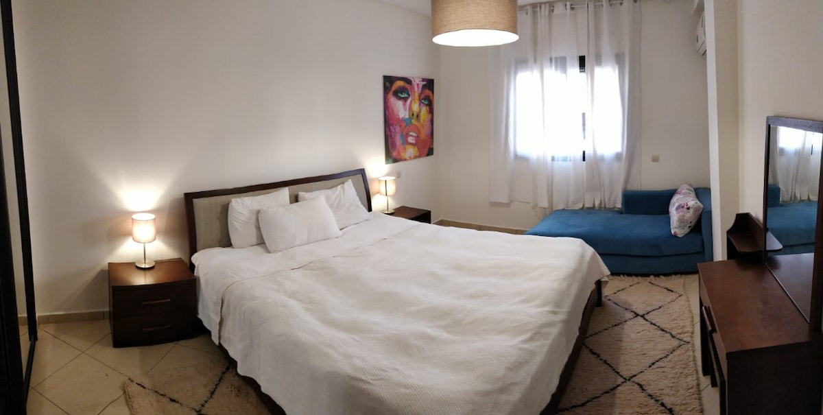 Séjournez en plein cœur de Marrakech dans notre appartement 2 chambres et 2 salles de bain. Profitez d'Une literie Simmons haut de gamme, WiFi haut débit (fibre optique) et d'une décoration moderne avec un bassin privé. Cuisine entièrement équipée, baignoire élégante, et douche italienne. À quelques pas de la place Jemaa el-Fna, du Plazza, et du Carré Eden. La piscine n’est pas chauffée. NB: Les couples marocains non mariés ne sont pas autorisés.