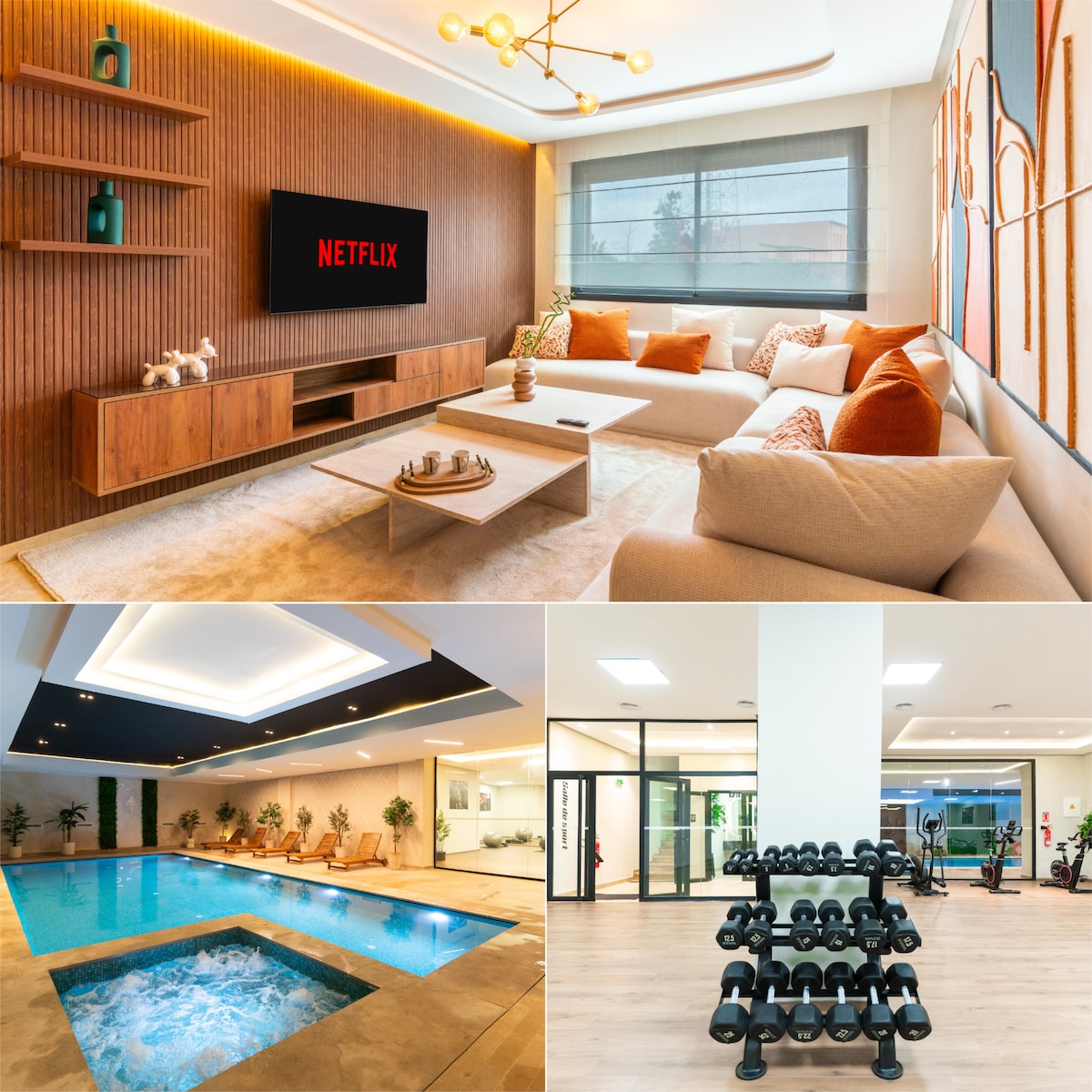 Naš stan se povoljno nalazi u srcu Marakeša. Željeznička stanica, brojni kafići, restorani, trgovine i supermarketi nalaze se na pješačkoj udaljenosti. Aerodrom je udaljen samo 12 minuta vožnje, što ga čini idealnim za putnike. • Objekat nudi brzi Wi-Fi, Netflix i IPTV, klima-uređaj, unutrašnji bazen, fitness centar, privatni, natkriveni parking i danonoćnu sigurnost i nadzor.