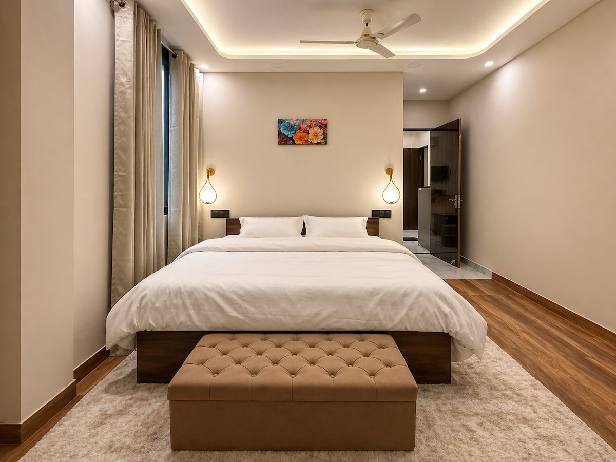 Stay at Orya Rochi, a 2 BHK calm apartment-style homestay in serene Varanasi, 10 mins from the airport. Ideal for families, couples, work trips, and long stays, it offers a fully equipped kitchen, RO drinking water, private washing machine, study/work area, sofa-cum-bed, wardrobes, daily cleaning, caretaker support, power backup, shared library, rooftop access, and a balcony sitting space with open countryside views. Orya Rochi is part of Orya Homestay. It offers premium group stays.