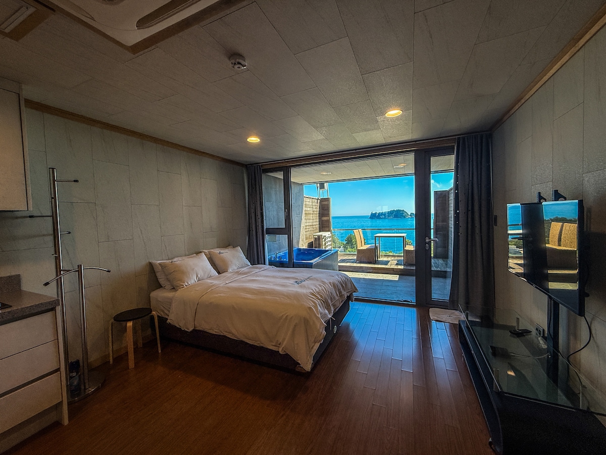 Hello. Perched on a cliff in central Seogwipo, this suite offers ocean views where islands and sea meet on one horizon. The 66㎡ private space keeps you apart from other travelers. Studio-style, yet spacious, with separate bedroom, living, and kitchen zones for an easy flow. On the terrace, soak in the spa and enjoy a private barbecue above the water. Free breakfast served with wide sea views. May to October, swim in the infinity pool facing Beomseom. The rooftop garden captures Jeju sunsets.