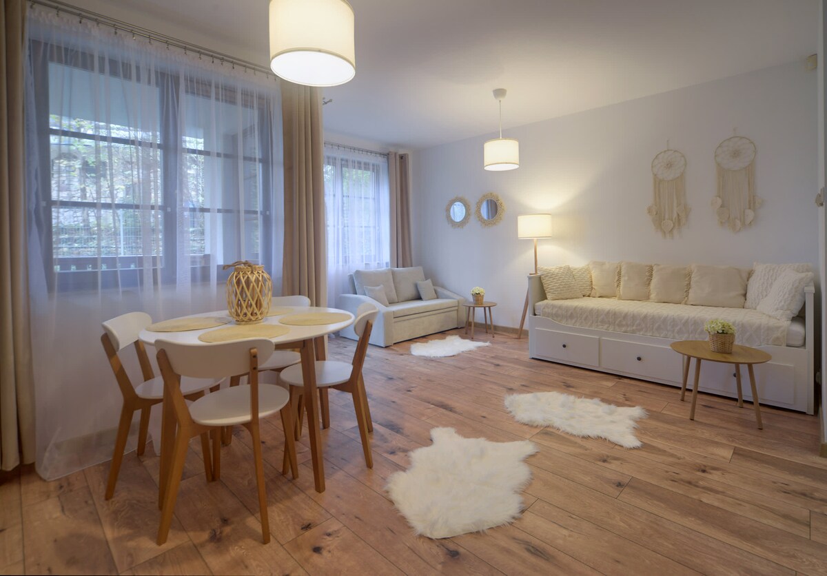 Stanovi u planinama BK nalaze se u Karpaczu, u blizini crkve Wang, Alpine Coaster, šarenog ljetnog tobogana i 150 m od hotela Gołębiewski (aquapark, kuglana, dječja igraonica i diskoteka). Svi stanovi uključuju dnevnu sobu, prostor za sjedenje s kaučem, TV, kablovske kanale, Wi-Fi, potpuno opremljenu čajnu kuhinju i privatno kupatilo. Obližnje atrakcije: vodeni park Tropikana, Wild Waterfall i skijaške staze za pješačenje
