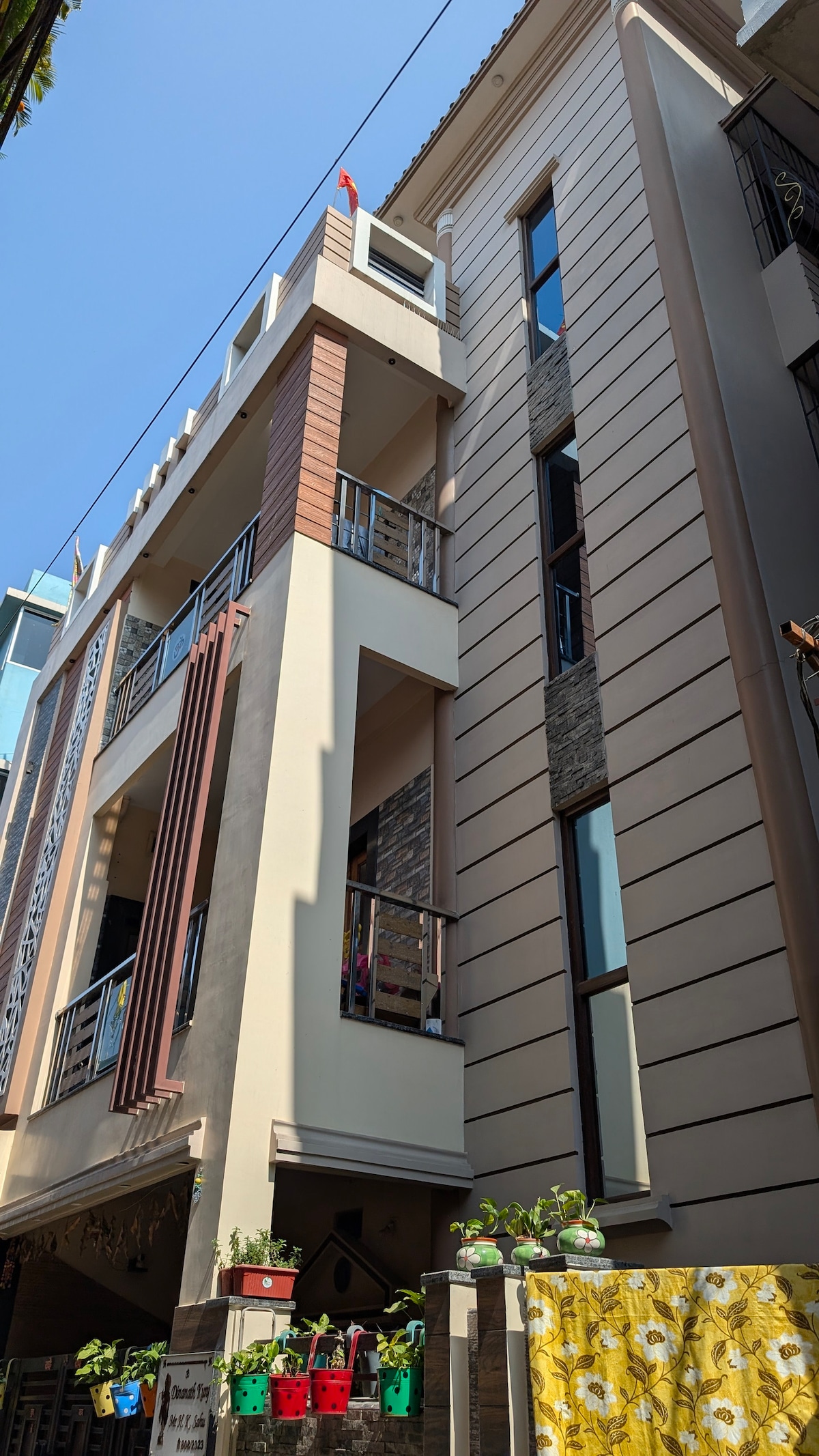 Nalazimo se na vrhunskoj lokaciji Ranchija. Aerodrom i željeznička stanica su udaljeni samo 5 minuta vožnje. Uključuje 1 salon s pametnim TV-om, 2 potpuno namještene spavaće sobe, 2 moderne kupaonice s priključenim gyserom, 1 potpuno opremljenu kuhinju, uključujući frižider i RO, 2 balkona, 1 prostor za mašinu za pranje veša. To je ograđeno društvo sa zaštitarom. Imamo sve osnovne sadržaje koji su potrebni za divan boravak. Naš objekat je vrlo prostran i obećavamo vam miran boravak.