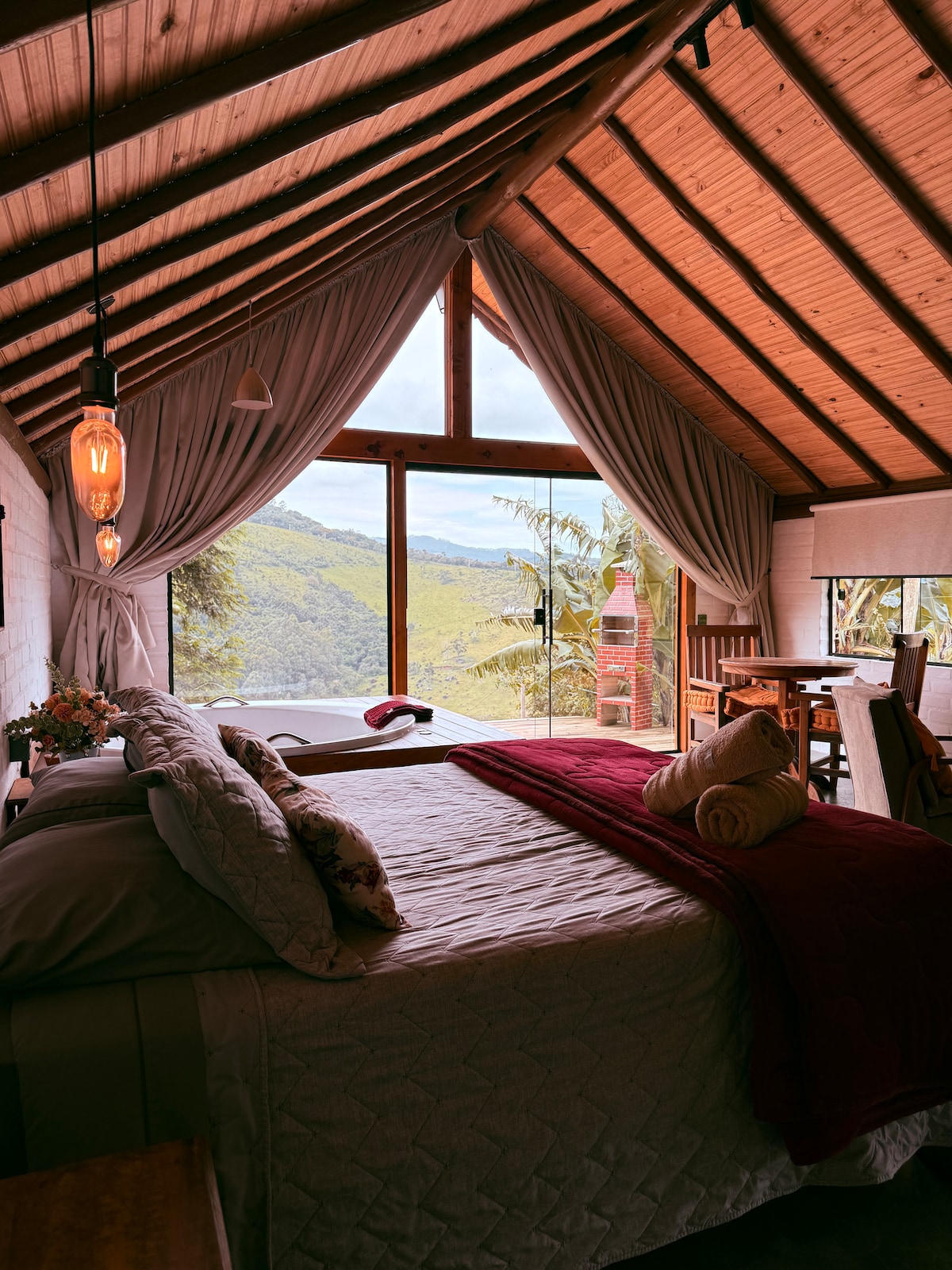 Cabana charmosa com vista deslumbrante da represa e montanhas. 2 suítes, sala com lareira, cozinha integrada com sala , lavabo, lavanderia e varanda com paisagem incrível. Relaxe na jacuzzi aquecida com cromoterapia, piscina com vista e terraço luar com fogueira fire pit. Wi-Fi, churrasqueira, espaço para home office e ambientes pensados para descanso e conexão com o essencial. Ideal para casais, famílias ou quem busca conforto na natureza Joanópolis menos 2h de São Paulo, 1h20 de Campinas