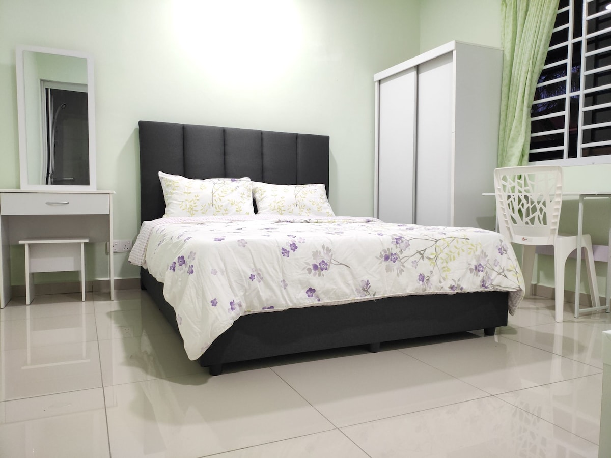 这是家庭房可以容纳5-7人住宿,房内有提供冷气和私人浴室,浴室也有热水器。 *民宿是一间双层排屋在保安区内,拥有5房间,5间浴室,房内提供冷气以及浴室也有热水浴, 民宿前面还有公园让你们和孩子有玩乐放松的休闲处.