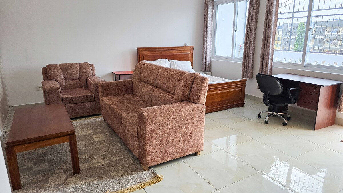 Udoban i elegantan 1BR Retreat u Bamburiju, Mombasa, Kenija. Dobro došli u naš elegantni jednosobni stan u Flora Apartments, Bamburi,Mtambo, Mombasa, Kenija. Dizajniran u umirujućim bež tonovima, ima udoban dnevni boravak, radni prostor, brzi Wi-Fi, potpuno opremljenu čajnu kuhinju i privatni balkon savršen za opuštanje. Samo nekoliko minuta od plaže Bamburi, tržnog centra City Mall i restorana, idealan je za parove, putnike koji putuju sami ili osobe koje rade na daljinu i traže udobnost i praktičnost.
