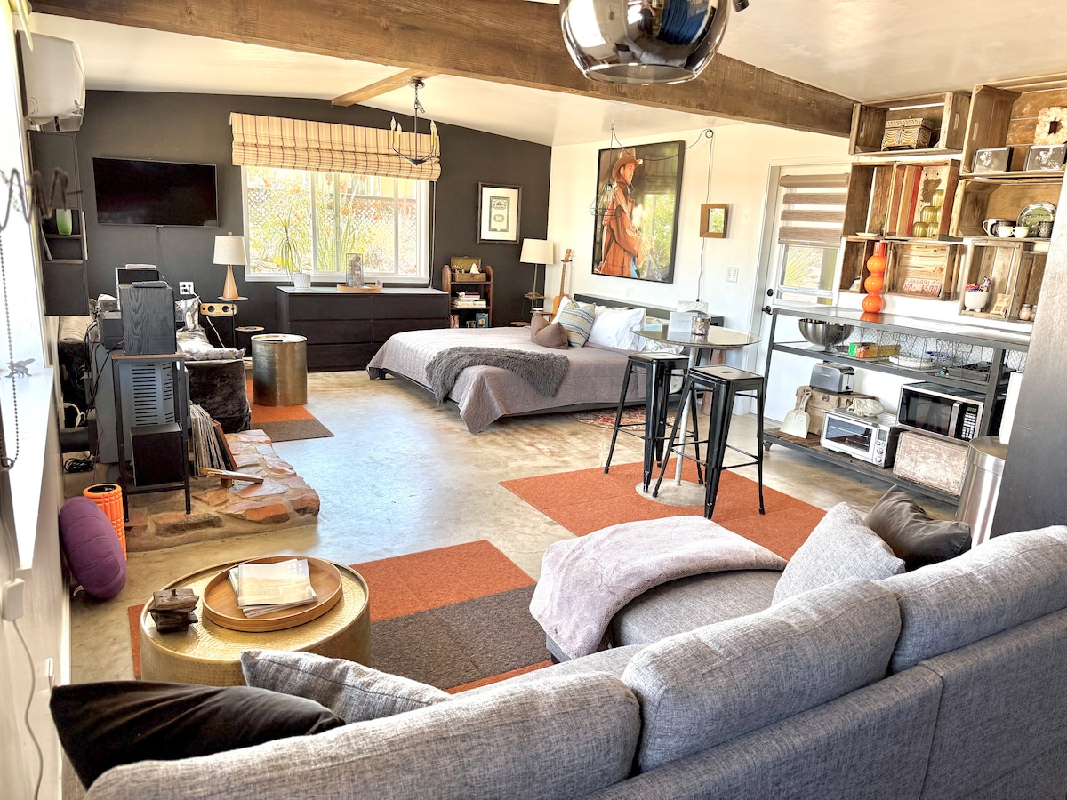 Views! Rare end of cul-de-sac, feel way out, feel an instant exhale. Relax, refresh, and reset in a sparsely populated horse community, perfect desert location close to where you'll go, just 4 minutes to the JT Village, 8 to the JTNP. Private studio duplex (east side) with dedicated parking & entrance. Vibe:Private! Yard, fire pit, & oversized windows, inside views. Gear:Kitchenette, Vinyl, & fast Wi-Fi. Recharge between desert adventures in my solar-powered sanctuary.