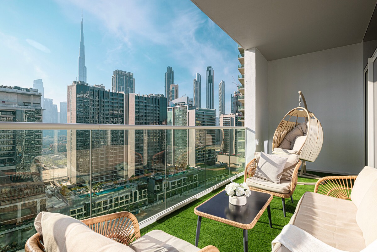 Pogled na Burj Khalifu s balkonom s travnatom travom u centru grada