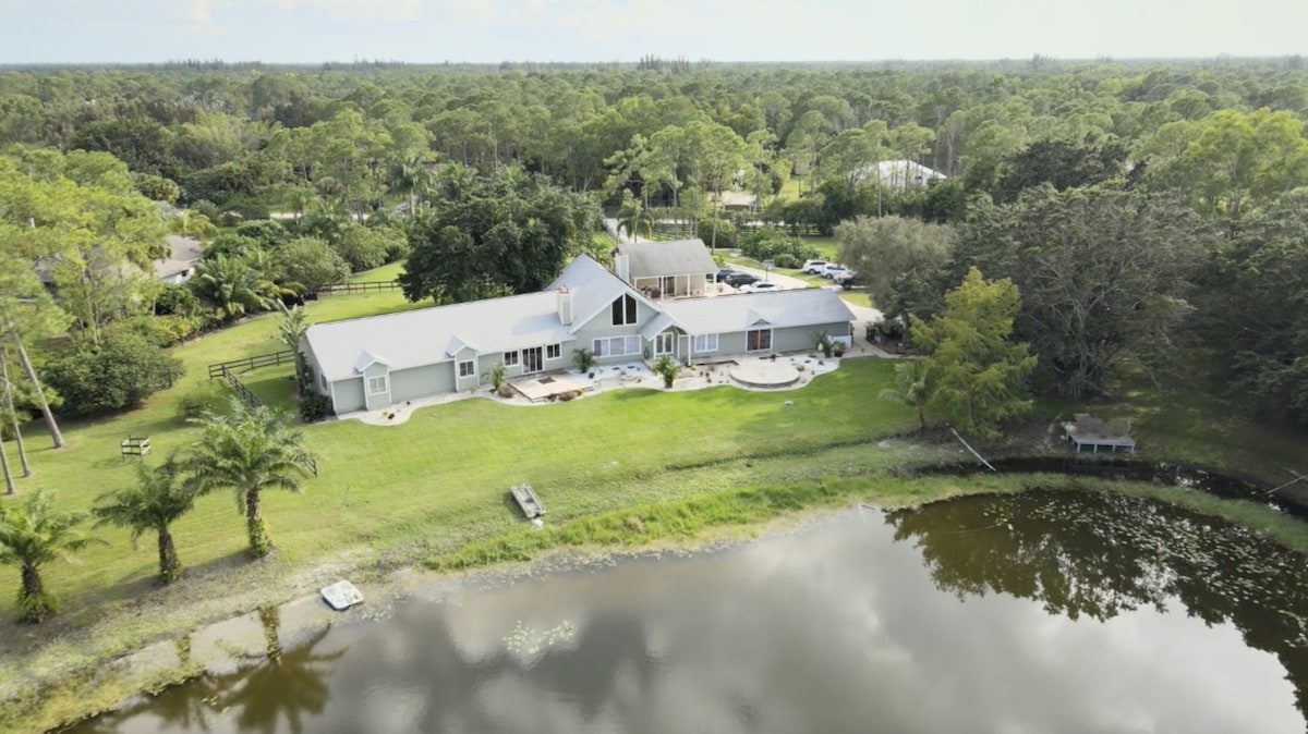 Pobjegnite u oazu mira u Soleil Farms, novouređenom utočištu za životinje od 5 hektara, luksuzni barndominium, koji se nalazi u Jupiter Farms, Florida. Smješten između bujne vegetacije i više od 55 spašenih domaćih životinja. Uživajte u prirodi u ovom potkrovlju preuređenom u staju od 2500 kvadratnih stopa uređenog imajući na umu luksuz i udobnost. Bilo da se želite opustiti i opustiti, avanturu, vino i večeru, ovo je savršeno mjesto da doživite najbolje od svega.