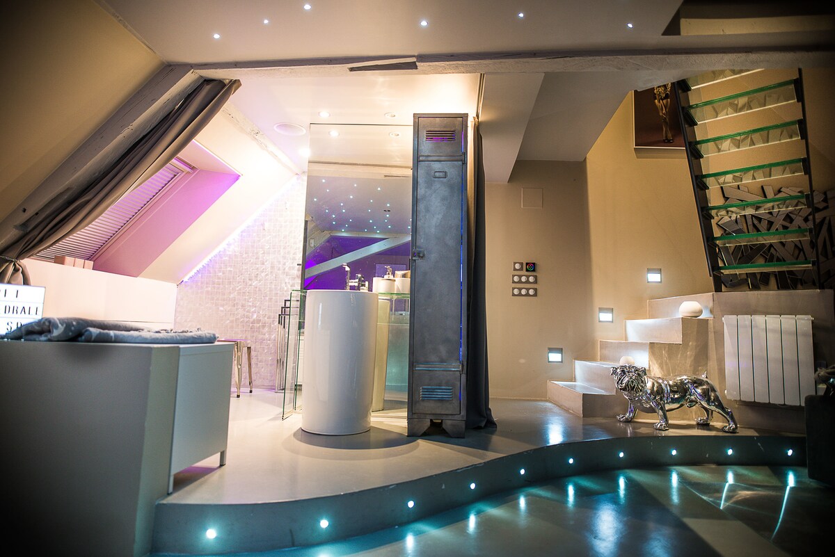 La Suit's Charmes vas dočekuje u toploj, ušuškanoj i umirujućoj atmosferi. Sanjajte, odmorite se, gledajte, osjećajte, prihvatite, pronađite sebe, pronađite sebe, povjerite se… Volite sebe… Dođite i uživajte u čarima odijela!! Apartman od 75 m2, željeznička stanica Belfort Jacuzzi Sauna Bračni krevet (180x200) 4K pametni TV, Netflix, Orange TV Wi-Fi Unutrašnji kamin Zvjezdano nebo XXL tuš s više mlaznica (nebeski tuš do danas nije dostupan) Sva posteljina je obezbijeđena Moguća opcija: erotska ljuljačka/ šampanjac/ zabava s kućanskim aparatima