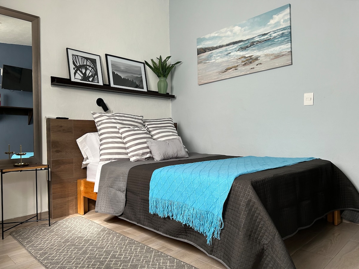 Moderan i potpuno opremljen potkrovlje u srcu historijskog centra Querétara. Idealno za parove, poslovne putnike ili srednje duge boravke. Ima: • Potkrovlje s bračnim krevetom (širine 150–179 cm) • Dvostruki kauč na razvlačenje • Klima uređaj • Opremljena čajna kuhinja • Potpuno privatno kupatilo • Trpezarija za 4 gosta • TV i odlična lokacija Samo nekoliko koraka od restorana, kafića, muzeja i svega najboljeg u centru grada. Savršeno za uživanje u gradu pješice ili udoban rad tokom vašeg boravka.