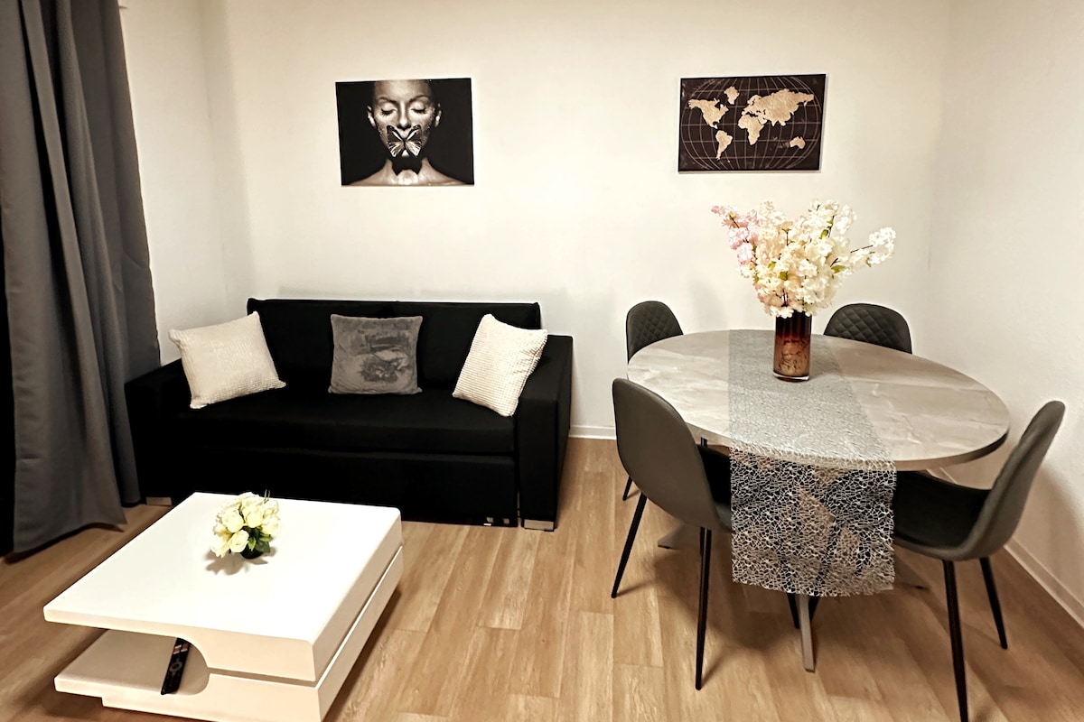 Stylish apartment with balcony and open views over Kaiserslautern. Ideal for business travelers, couples or small groups. 2 separate bedrooms with king/queen beds, 65” Smart TV with streaming, high-speed WiFi and workspace. Fully equipped kitchen with coffee & tea station, washer-dryer and a calm atmosphere. Central location near main station, city center, restaurants and easy access to Ramstein Air Base. Registration number: NV-2023-420