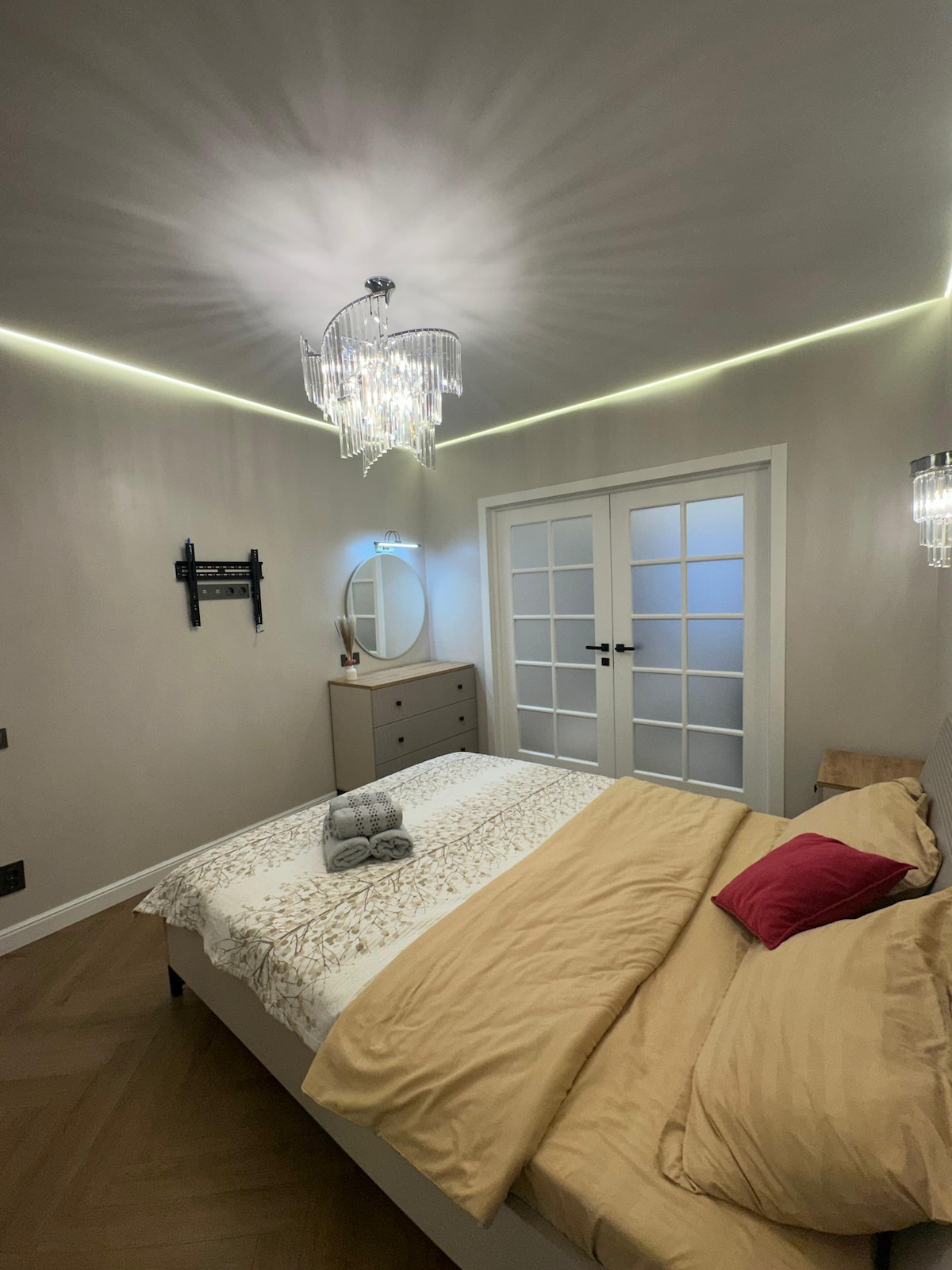 Stan u Rams Cityju, vaša oaza stila i udobnosti u Almatiju Dobro došli u apartman Golden Rose, svijetli, elegantni i pažljivo uređeni apartman dizajniran za one koji cijene ljepotu, udobnost i praktičnost. Unutrašnjost je dizajnirana u stilu moderne renesanse: nježni ružičasti naglasci, smaragdni tonovi, zlatni detalji i klasični oblici stvaraju atmosferu mira i vrhunske udobnosti.