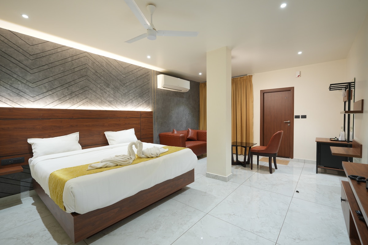 Welcome to the Harmony Suite, our finest room boasting stunning views. Enjoy the same luxurious comforts as our other rooms, including Smart TVs with OTT platforms, digital lock access, and elegant decor. Perfect for a serene and stylish stay.
