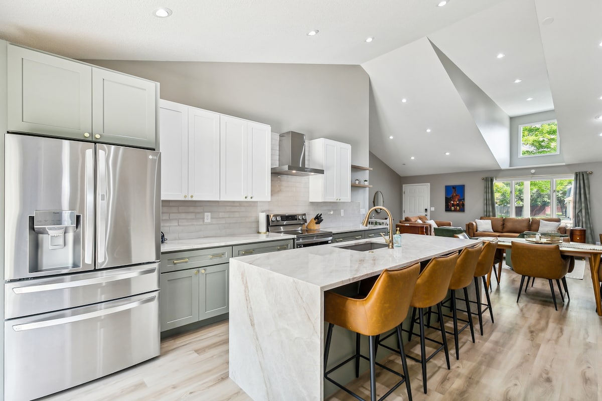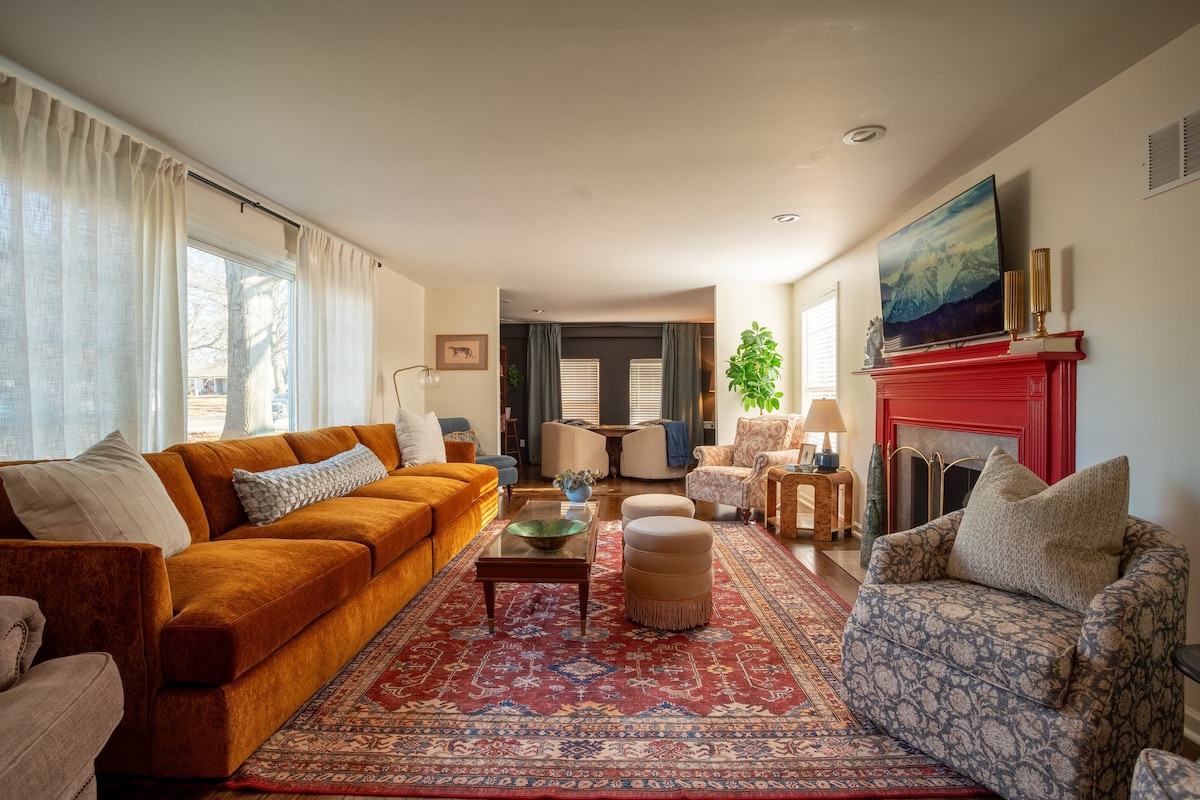 Zabavno moderno utočište u kojem ćete se osjećati kao kod kuće i opustiti se. S 3 udobne spavaće sobe možete lako spavati 8 osoba, pa čak i opustiti se i uživati u filmovima ili igrama na velikom pozorišnom ekranu. U blizini Top golfa, restorana i nekoliko minuta od kongresnog centra Overland Park, naša kuća ima jednostavan pristup autoputu. Uživajte u obližnjim terenima za golf ili lokalnim atrakcijama. Moderan stilski namještaj ispunjava smještaj, uključujući plišane krevete, luksuznu posteljinu, opremljenu kuhinju, punu vešeraj i Wi-Fi od 1 GB za rad ili streaming.