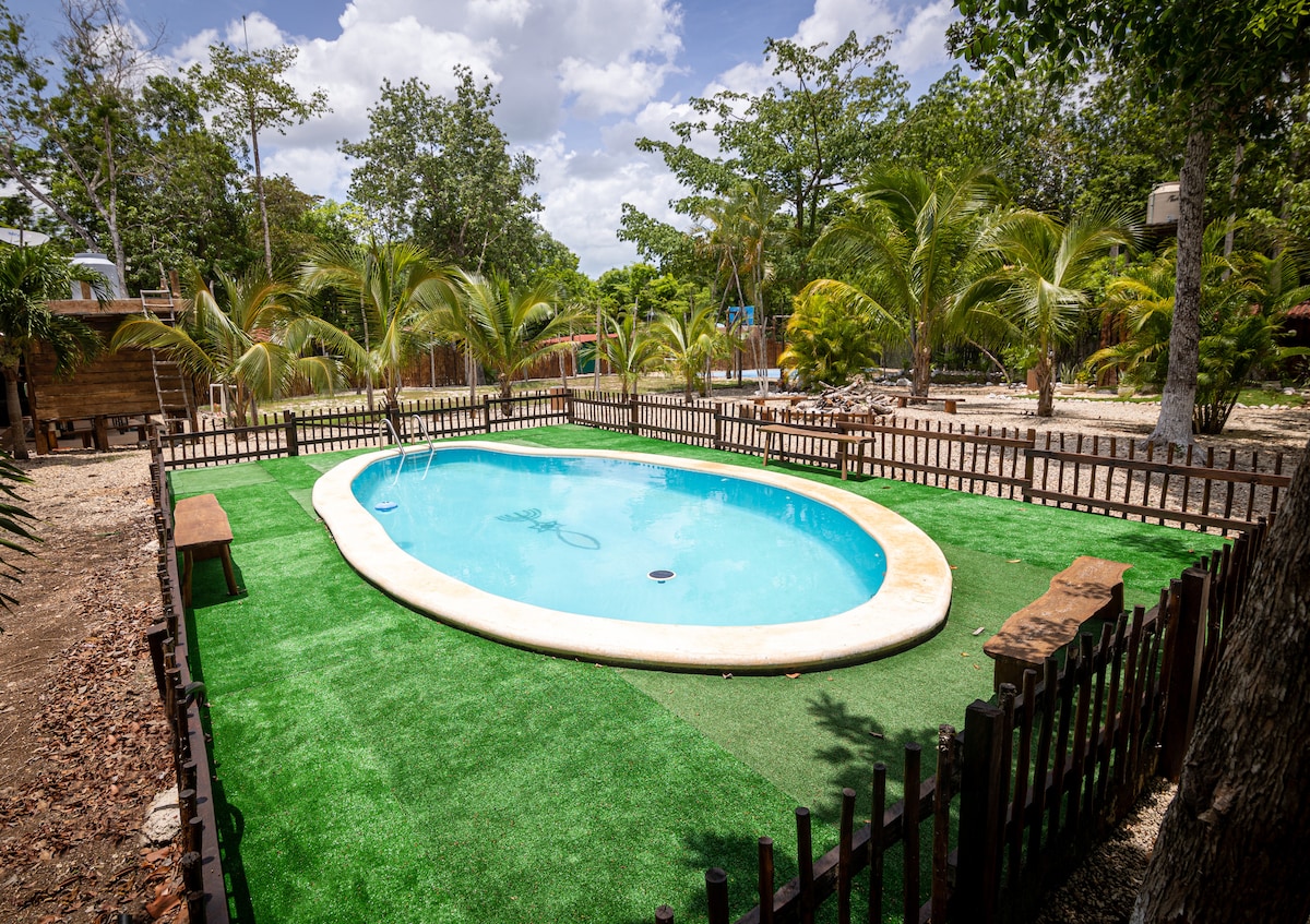 S ovim jedinstvenim smještajem, sve važne kontakt osobe su u blizini, što olakšava planiranje boravka. Nalazimo se na mjestu između Riviere Maya, Ruta de los Cenotes , Yucatan i Cancun. Održiva organska hrana prikladna za životinje i organska organska hrana nas karakteriše. Odlično mjesto za opuštajući odmor s mnogo izleta. Uživajte u životu u privatnom zelenom raju s lokalnim biljkama, životinjama i privatnim bazenom.