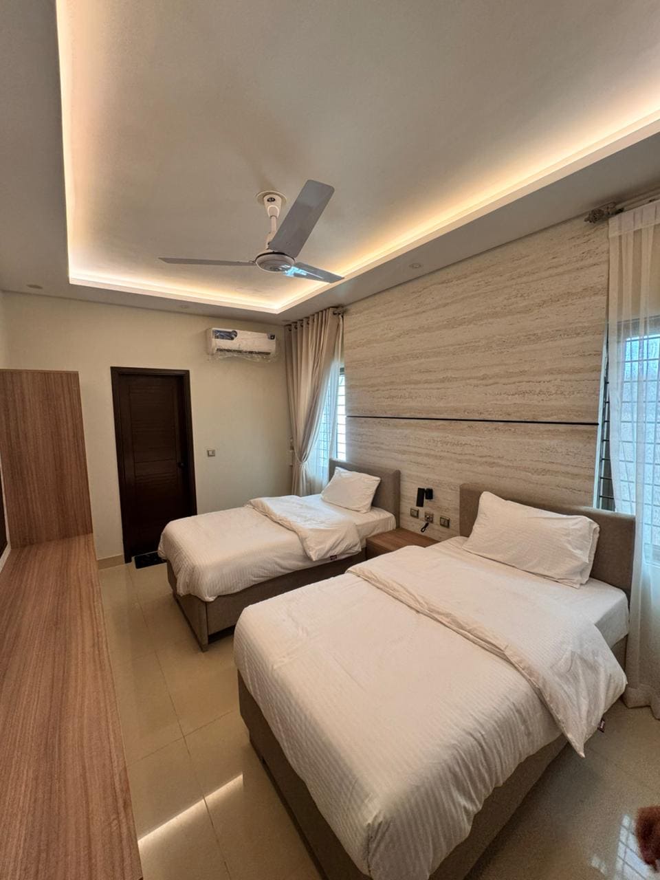 3 double bedrooms each with a ceiling fan and air conditioning with heating. There is a kitchen (with a cooker, microwave, a large fridge/freezer, kettle and toaster), 3 private bathrooms with shower and a lounge with dining table including a drawing room for guests. Inside private car parking space available with complementary WiFi... Please note: electricity will be charged extra at 33 Pakistani rupees per unit.