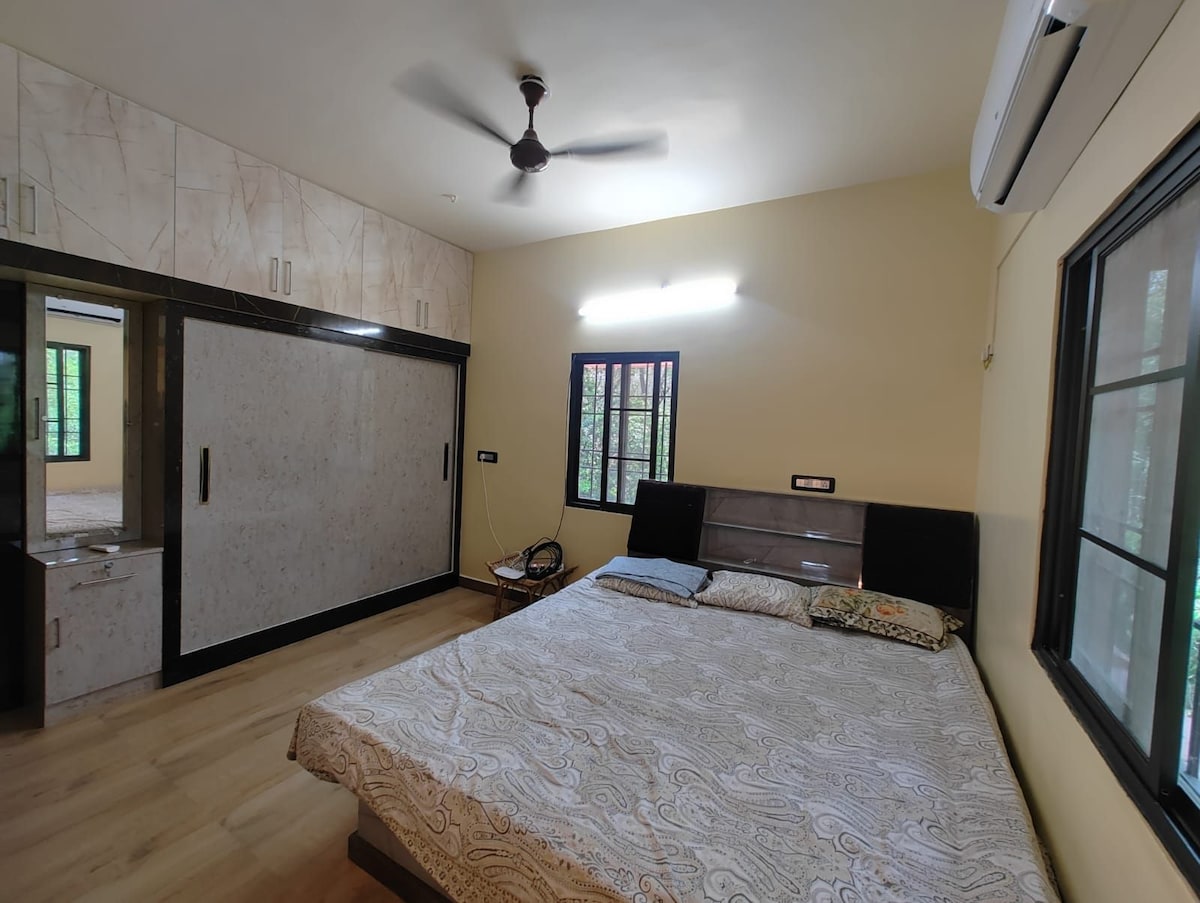 Sri Krishna Palace 🌸 – gdje se božanstvo susreće s udobnošću uz malo zabave 😎. Boravite u prostranom smještaju s 2 spavaće sobe i kuhinjom s pogledom na planinu Arunachala 🏔️, samo 3 km (7–10 min) od hrama🚗. Obje spavaće sobe imaju klima-uređaj i spojena kupatila 🚿, tako da nema jutarnjih čekanja 🙌. Udoban dnevni boravak, kuhinja za ponoćni maggi 🍜, besplatna topla i hladna voda za piće 💧, Wi-Fi brži od zvona hrama koja zvone 📶, parking 🚘, CCTV 🛡️ i pametna brava 🔑. UPS backup ⚡ (osim AC) održava stvari glatkim.