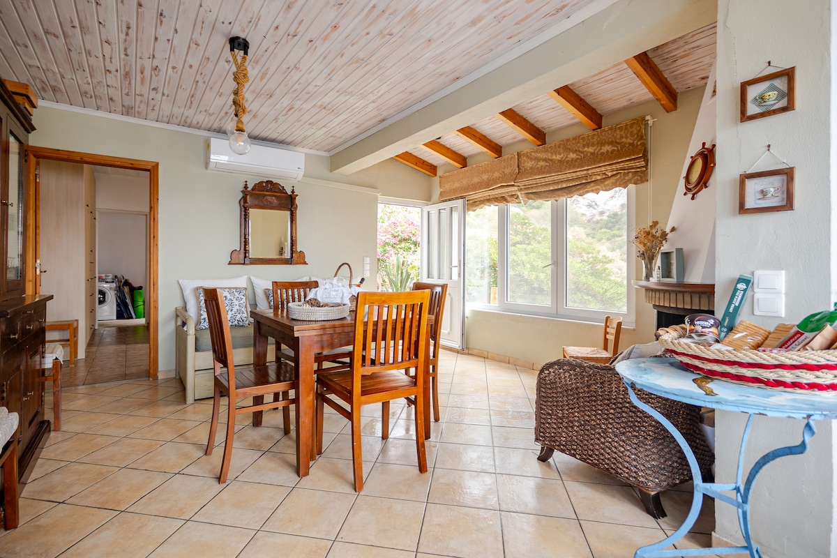 Das traditionelle Steinhaus grenzt an einer Seite an die natürliche Felswand. Das Bad ist ganz in den Fels hinein gebaut. Das ergibt ein ganz spektakuläres Wohngefühl und den Eindruck, mitten in der Natur zu sein. Die Terrasse hat eine wunderschöne Aussicht auf das Meer, den Strand von Fytema und die Berge von Messaria. Die Wohnung ist 2023 mit ökologischen Materialien im traditionellen Stil ausgebaut worden. Zum Strand sind es nur 200 m.