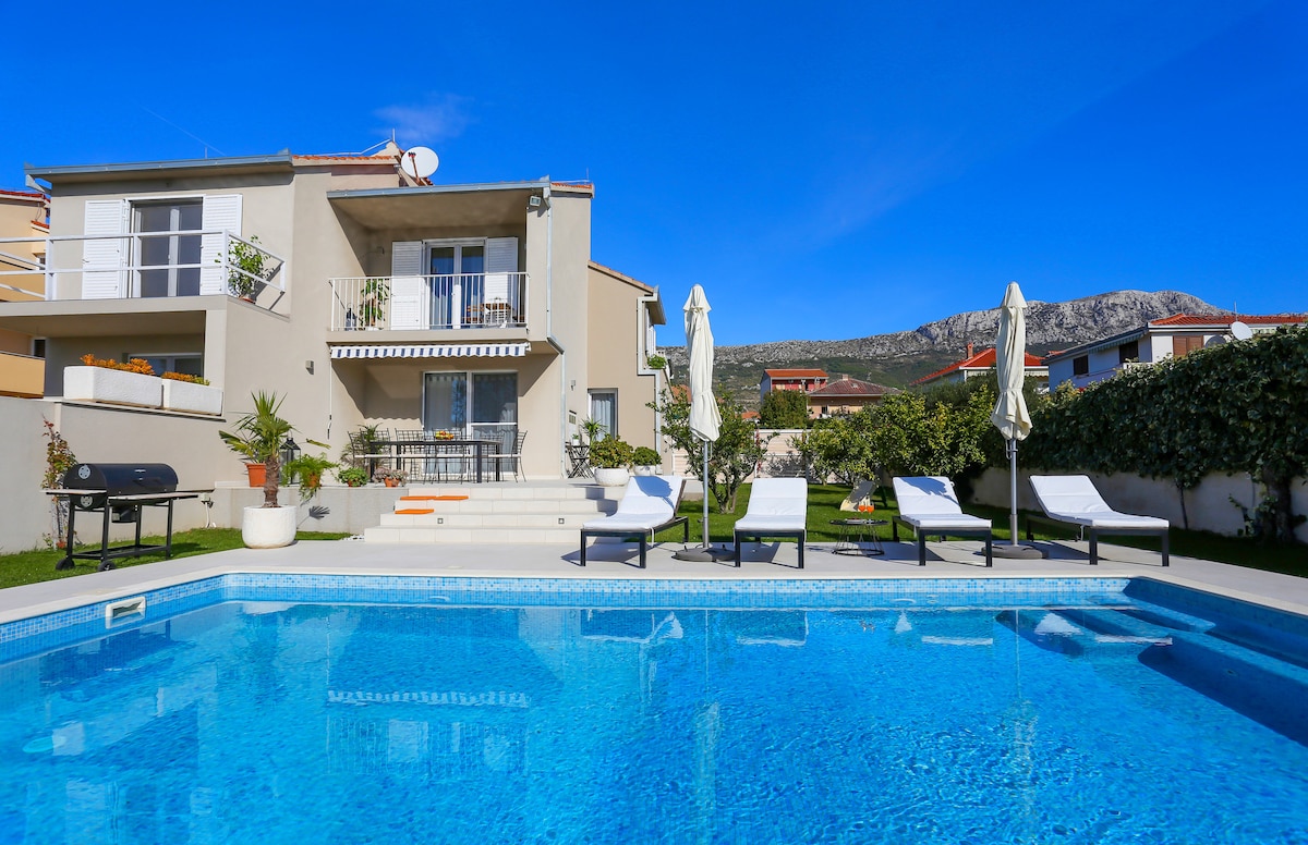 Ova vila se nalazi na brdu sa prirodom iznad grada Kaštela na visini od 200 m nadmorske visine. Kuća je spoj između luksuza i tradicionalnog dalmatinskog stila. Cijeli objekat je za jednu grupu gostiju i tokom vašeg boravka ništa se ne dijeli ni sa kim. Udaljenost od centra Splita i Trogira je 20 min. , Aerodrom SPLIT (SPU) i marina za jahte 10 min, plaža i more 7 min. Cijeli objekat je dostupan isključivo našim gostima i oni imaju potpunu privatnost.