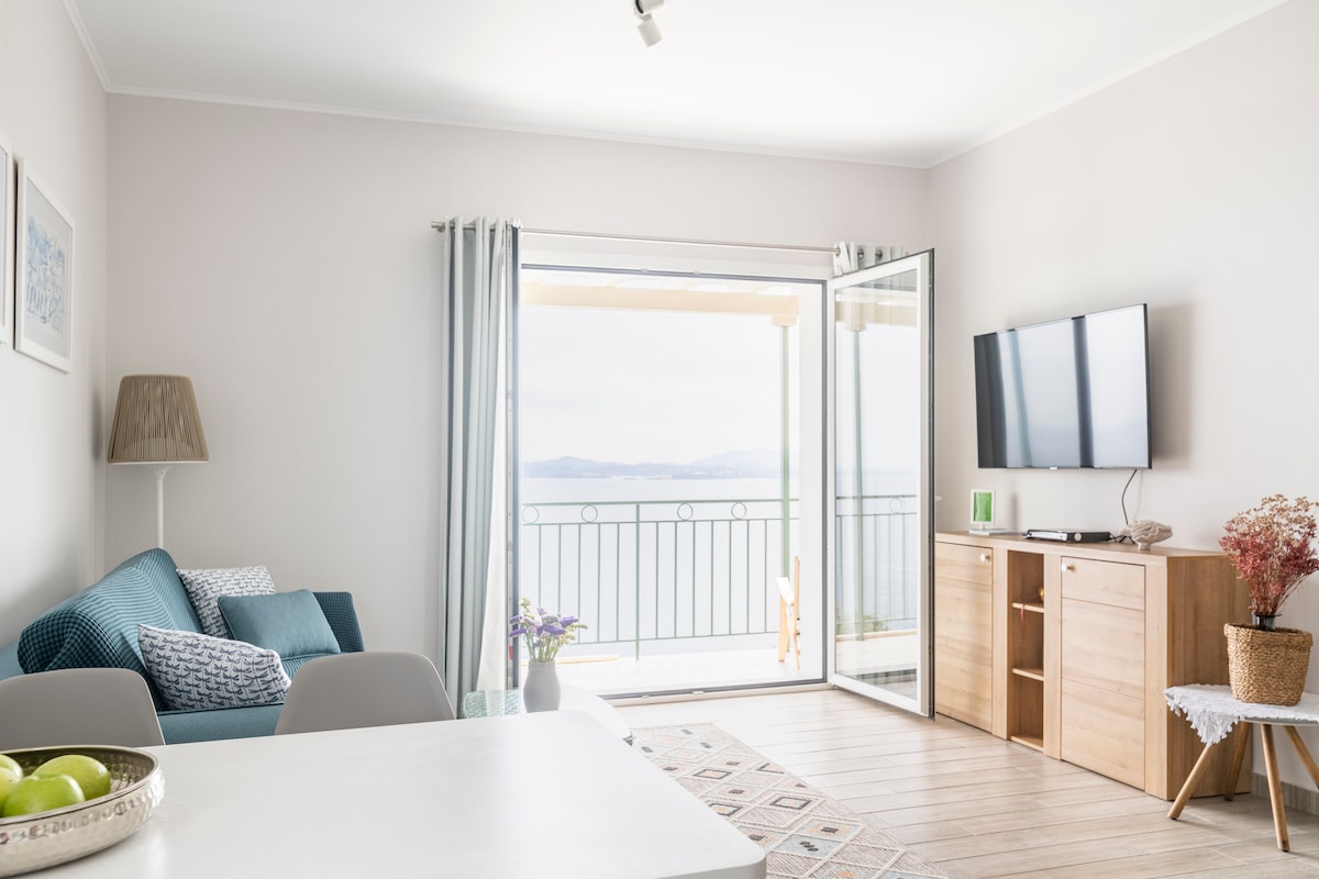 Uživajte u ovom ljetnom odmaralištu smještenom na litici zaljeva Kalami. Prekrasan pogled na zaljev učinit će vas idealnim mjestom za opuštanje, a sunce i kristalno čista voda Jonskog mora učinit će vaš odmor nezaboravnim. Ovaj udoban apartman ima bračni krevet, vlastitu kupaonicu i kuhinju te naravno privatni balkon s prekrasnim pogledom na more. Plaža i selo udaljeni su 5 minuta hoda.