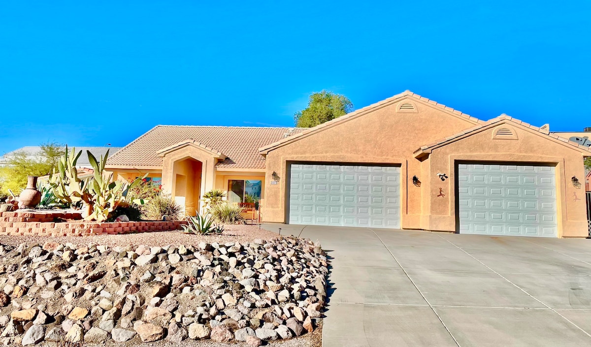 Opustite se i uživajte u pustinjskom krajoliku. Skrovit, privatan i prostran cijeli smještaj od 2400 kvadratnih metara s grijanim bazenom i masažnom kadom (pogledajte kućni red). Potpuno prilagođen dom, lijepo uređen s dizajnerskim namještajem. 10 minuta udaljen od mosta Laughlin i Katherineinog slijetanja, ali je svijet odvojen. Mirno, mirno, privatno, s nevjerovatnim pogledom na zvijezde, gradska svjetla, planinske pejzaže. Jedinstveni pustinjski odmor. Mnogo jednostavnog i sigurnog parkinga za brod ili tegljače igračaka, pristup stazama.
