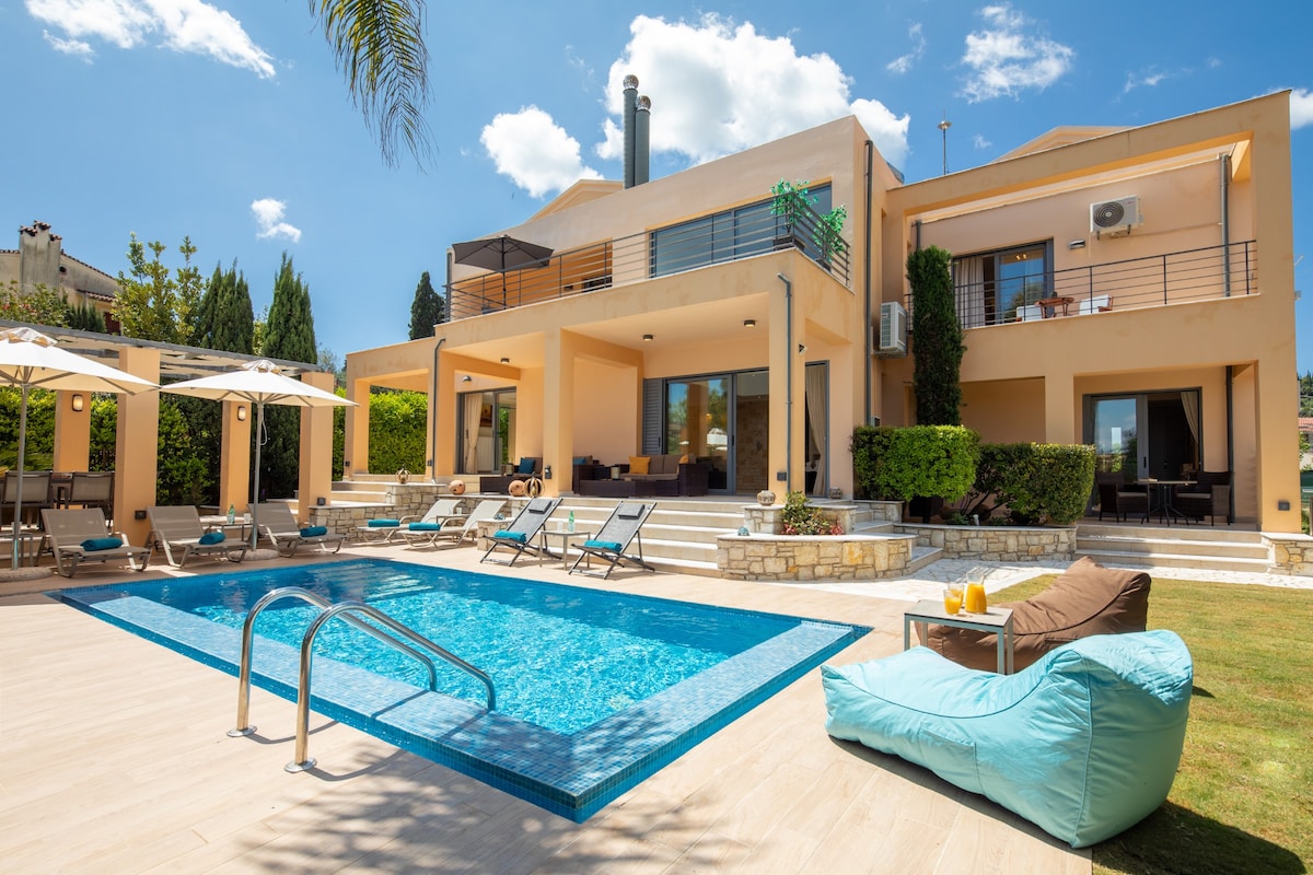 Otkrijte luksuz i mir u Villi Nikos! Smješten na privatnoj, ograđenoj parceli s prekrasnim pogledom na planine i zalazak sunca. Ova vila može primiti do 5 gostiju s dvije spavaće sobe (jedan bračni krevet, dva kreveta za jednu osobu) i kaučem na razvlačenje u dnevnom boravku. Uživajte u dva moderna kupatila, potpuno opremljenoj kuhinji i mašini za pranje veša. Vanjski sadržaji uključuju bazen, prostor za roštilj i vrt. Ostanite aktivni u teretani. Doživite privatnost i udobnost u Villi Nikos, vašem savršenom utočištu na Krfu.