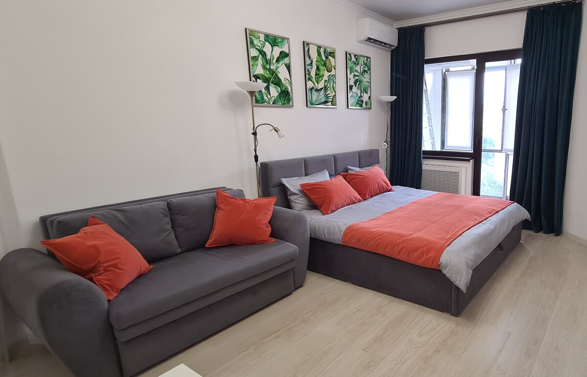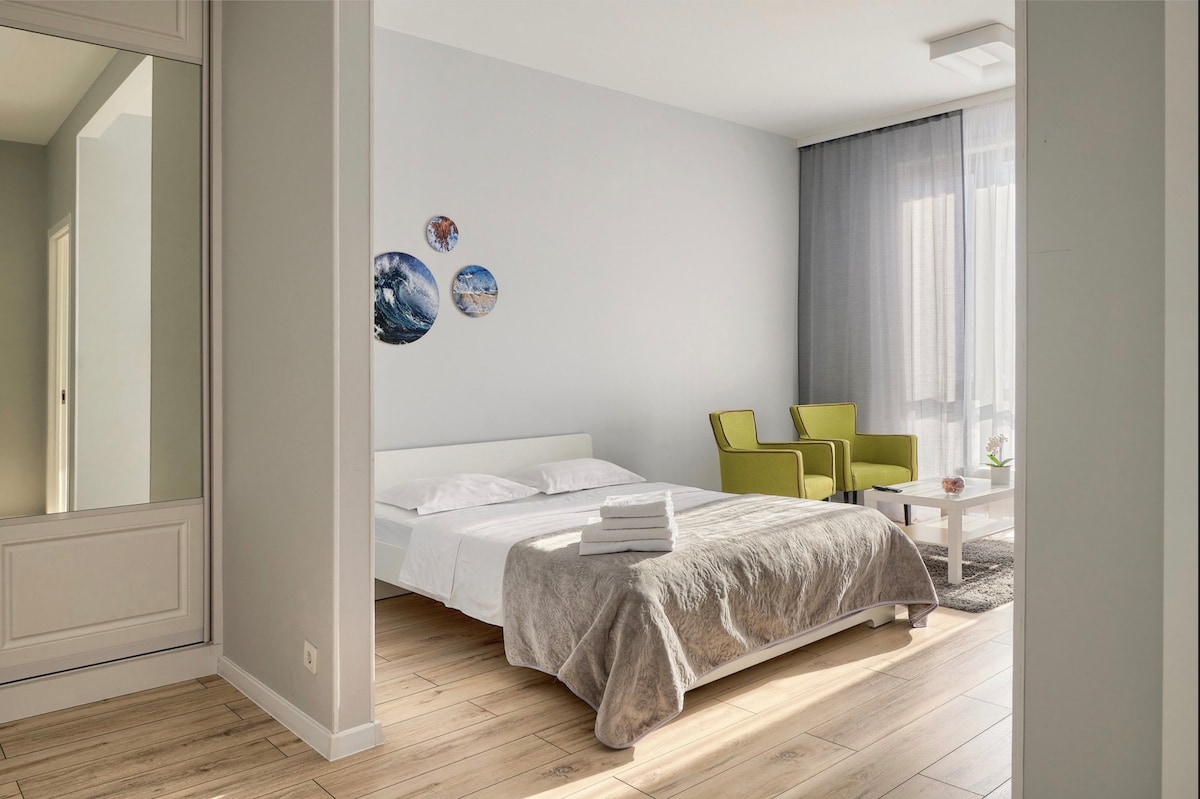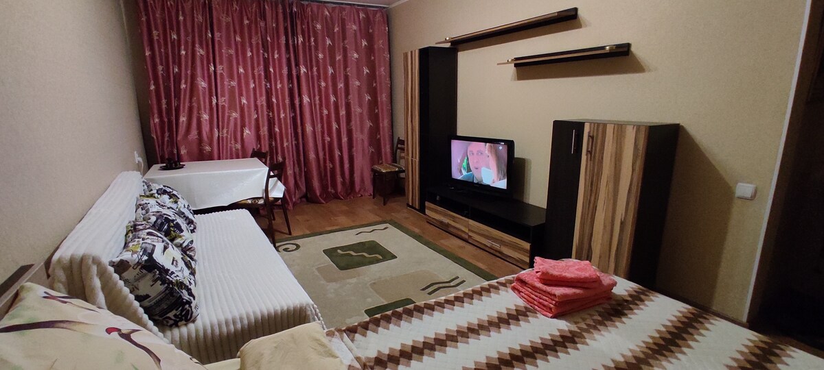 Modern 2-bedroom apartment for up to 6 guests at “Miracle is a Miracle and Warm Home”. Top floor with 2 bathrooms, air conditioning, fast Wi-Fi, and elevator. Bedroom 1 has a double bed, Bedroom 2 with closing partition, plus sofa bed in studio. Fully equipped kitchen and living area. Only 2–3 min walk to Baykonur Metro, cafes, restaurants, Central Stadium & Olympic Sports Complex. Perfect for families, groups, or business travelers.