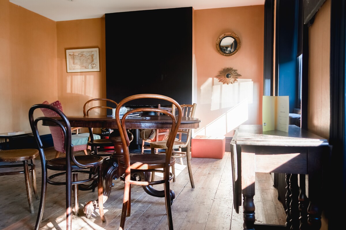 Modja Modja House is more than an Airbnb—it’s a design-led stay with Japanese-influenced interiors where comfort and creativity meet. Room One has a Naturalmat king-size organic wool bed, bespoke cabinetry, and a spa-like en suite with a moss-green clawfoot bath. A calming sound machine by Yuri Suzuki sets the tone. Enjoy complimentary breakfast in the art-filled dining room. The Times calls it “about as boutique as guesthouses get..Stay here and they’ll help you plug into the town’s art scene.”
