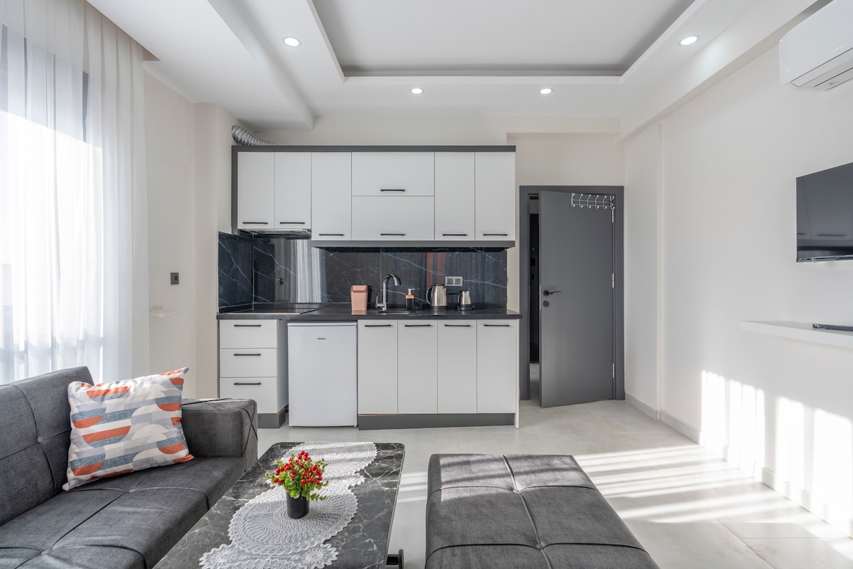 Blue Flag Konyaaltı Beachpark 2km, Old Town 3km .1 spavaća soba 1 bračni krevet i dnevni boravak s kaučem na razvlačenje. Nedavno izgrađeni stanovi otporni na zemljotrese, zrak u našem je dezinfikovan Ozone Systems.24/7 recepcija. Lokalni park je dobar za zabavu djece i za odrasle sportska oprema za vježbanje za javnu upotrebu. Lokalni supermarketi 1 min. Potpuno opremljena kuhinja, prodavnice, trgovački centri i restorani u neposrednoj blizini, lokalni autobus i tramvaj deset minuta hoda, mnoge atrakcije u Antaliji na dohvat ruke.