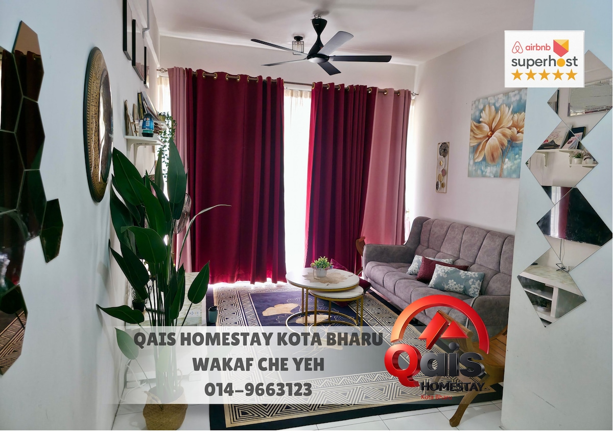 Qais Homestay nalazi se u jedinici 1A-05, na prvom spratu, rezidencija 3A Taman Iman Jaya u blizini popularnog trgovačkog centra u Kelantanu, Wakaf Che Yeh. Udaljenost do centra grada i nekih od vodećih trgovačkih centara u Kota Bharu je samo 10-15 minuta odavde. Ovaj apartman je opremljen namještajem i kućnim aparatima, uključujući klima uređaj u dvije glavne sobe, što će zasigurno učiniti da se gosti osjećaju kao kod kuće.