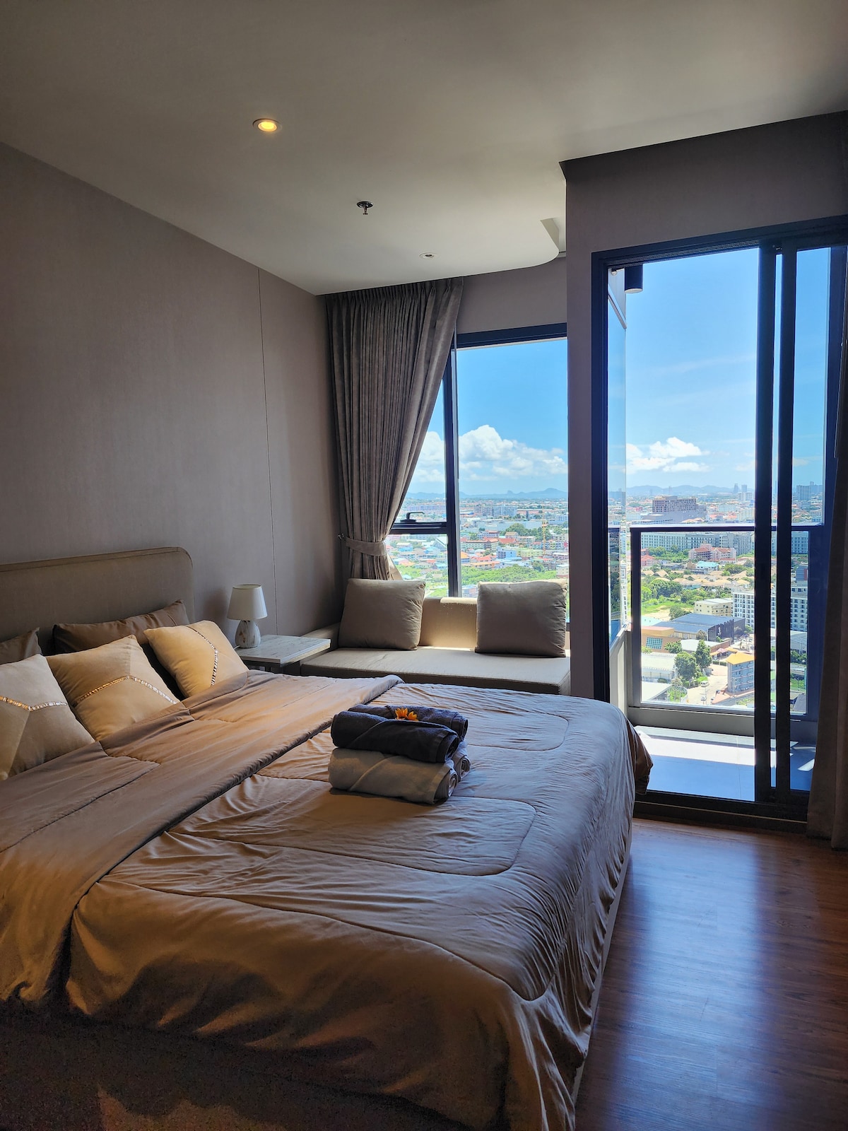Dobro došli u Qihai Phase 1 Condo pored plaže Jomtien u Pattayi! Stan se nalazi u mirnom i praktičnom području Zhongtian, oko 10 minuta hoda do meke pješčane plaže i pogleda na more.Ovo je više od smještaja, to je sveobuhvatno iskustvo odmora. Okruženje je usredotočeno oko pažljivo dizajniranog kompleksa bazena s više tema, s više bazena povezanih poput safira, s vodenim elementima, kao da boravite u privatnom vodenom parku.Također možete besplatno pristupiti teretani i sauni kako biste ostali aktivni i opustili se tokom putovanja. Ova pažljivo uređena udobna soba u krem stilu, s mekim tonovima i ugodnom atmosferom, pruža vam idealno mjesto za opuštanje tokom putovanja.Soba je potpuno opremljena: · Prostor za spavanje je opremljen udobnim bračnim krevetom, mekom posteljinom koja ne iritira kožu. · Odvojene mokre i suhe prostorije u privatnom kupatilu, 24-satno snabdijevanje toplom vodom; · Potpuno opremljena otvorena čajna kuhinja: frižider, mikrovalna pećnica, indukcijski štednjak, osnovni kuhinjski pribor, jednostavni obroci. · Dnevne potrepštine kao što su četkice za zube za jednokratnu upotrebu, papuče, maramice, deterdžent za pranje veša itd. pripremljene su za bezbrižan boravak; · Balkon ima veš mašinu i stalak za vješanje koji se može podizati i spuštati, što je vrlo praktično.Pogled kroz prozor je otvoren – u blizini se nalazi bujni zeleni pojas, a u daljini se vidi more i nebo, s pogledom ujutro i uveče. Ima praktičnost i privatnost života u stanu, kao i slobodno vrijeme i romantiku odmarališta.Bilo da se radi o odmoru za parove, malom porodičnom odmoru ili grupi prijatelja, ovdje možete pronaći udobnost i radost. Radujemo se što ćemo dodati osjećaj mira i ljepote vašem boravku na plaži u Pattayi!