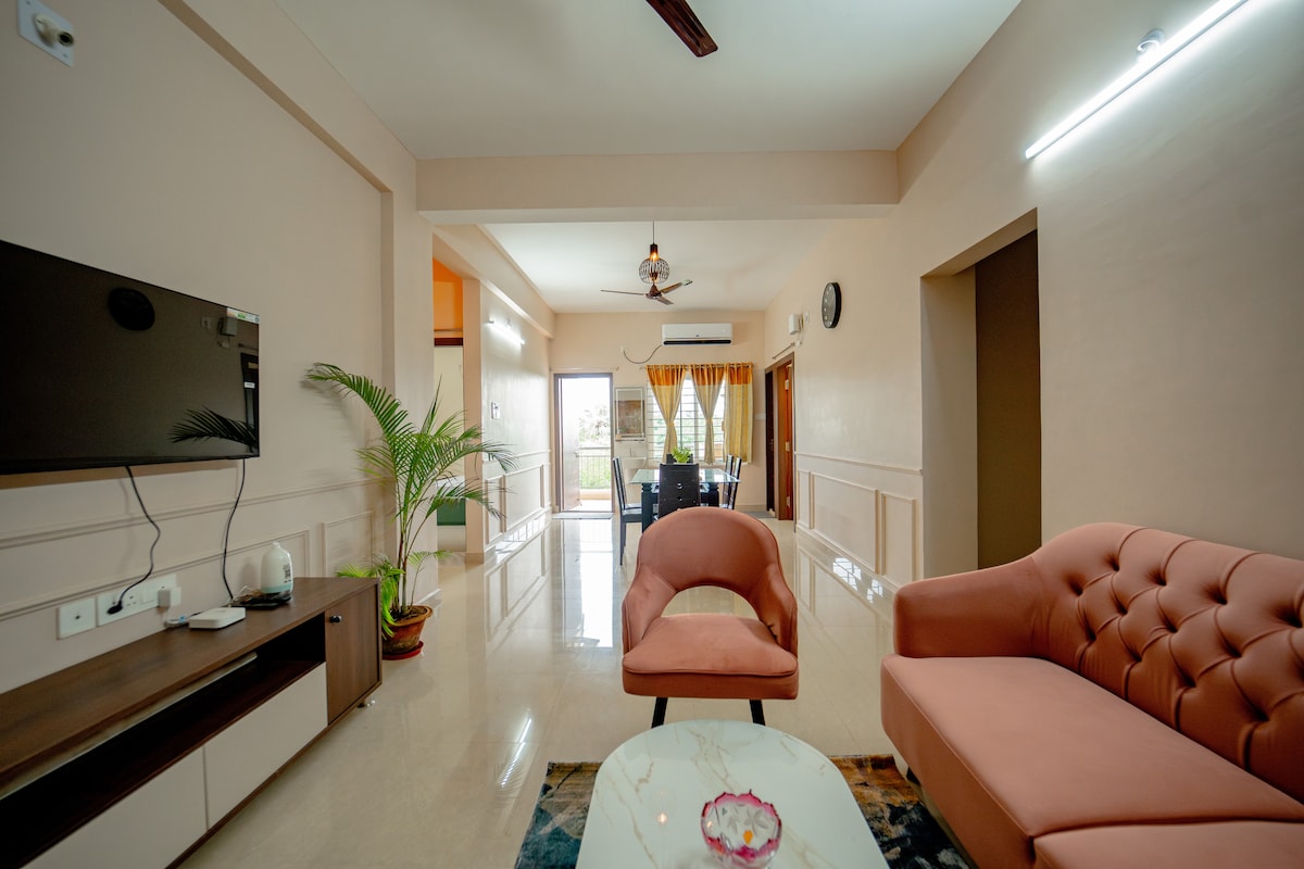 Dobro došli u Amber & Jade Stays, vaš udoban dom daleko od doma u mirnom predgrađu Bhubaneswara. Ovaj elegantni 1BHK spaja udobnost i prirodu sa svijetlim dnevnim boravkom, potpuno opremljenom kuhinjom i plišanom spavaćom sobom s bračnim krevetom. Uživajte u modernim sadržajima kao što su Wi-Fi, klima uređaj i pametni TV u mirnom okruženju prikladnom za kućne ljubimce okruženom zelenilom. Savršeno je za parove, putnike ili radnike na daljinu koji traže mir i praktičnost. Povedite svog krznenog prijatelja i opustite se u udobnosti smještaja Amber & Jade. 🐾
