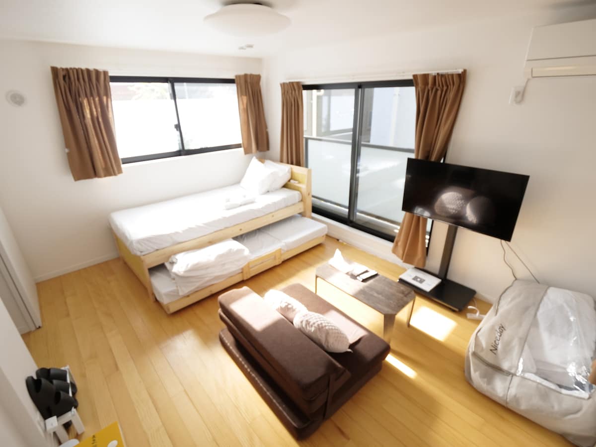 【2018年築の新築マンションのゲストハウス】 吉祥寺駅からバス10分の住宅街にある宿がKJ House。 吉祥寺駅から新宿までJR線でわずか14分の場所にありながら、都心の喧騒とは離れ静かな場所にあります。近くにはコンビニも充実しています。 『友人・カップルとゆっくり過ごせる家』をコンセプトにしており、長期間のご滞在にぴったりです。 最寄り駅の吉祥寺駅の商店街では活気あふれる日本の雰囲気を味わうことができます。電車では乗換なしで新宿駅まで15分、渋谷駅まで17分(急行で5駅)でアクセスできるので便利です。 重要 ・当宿泊施設は吉祥寺駅からバスで約10分の場所にあります。 ・玄関と地下のリビングが繋がっているため落ちないようにお気をつけ下さい。手すりがないです ・お風呂とトイレは3階にあります。足の悪い方や高齢の方にはお勧めできません ・リビングはソファベッドになります。 ・目の前が庭のためたまに小さな蜘蛛が出る可能性があります。 ・寝室はロフトになっており天井が低いです ・宿の近くで工事が行われており、日中音が聞こえる可能性あり