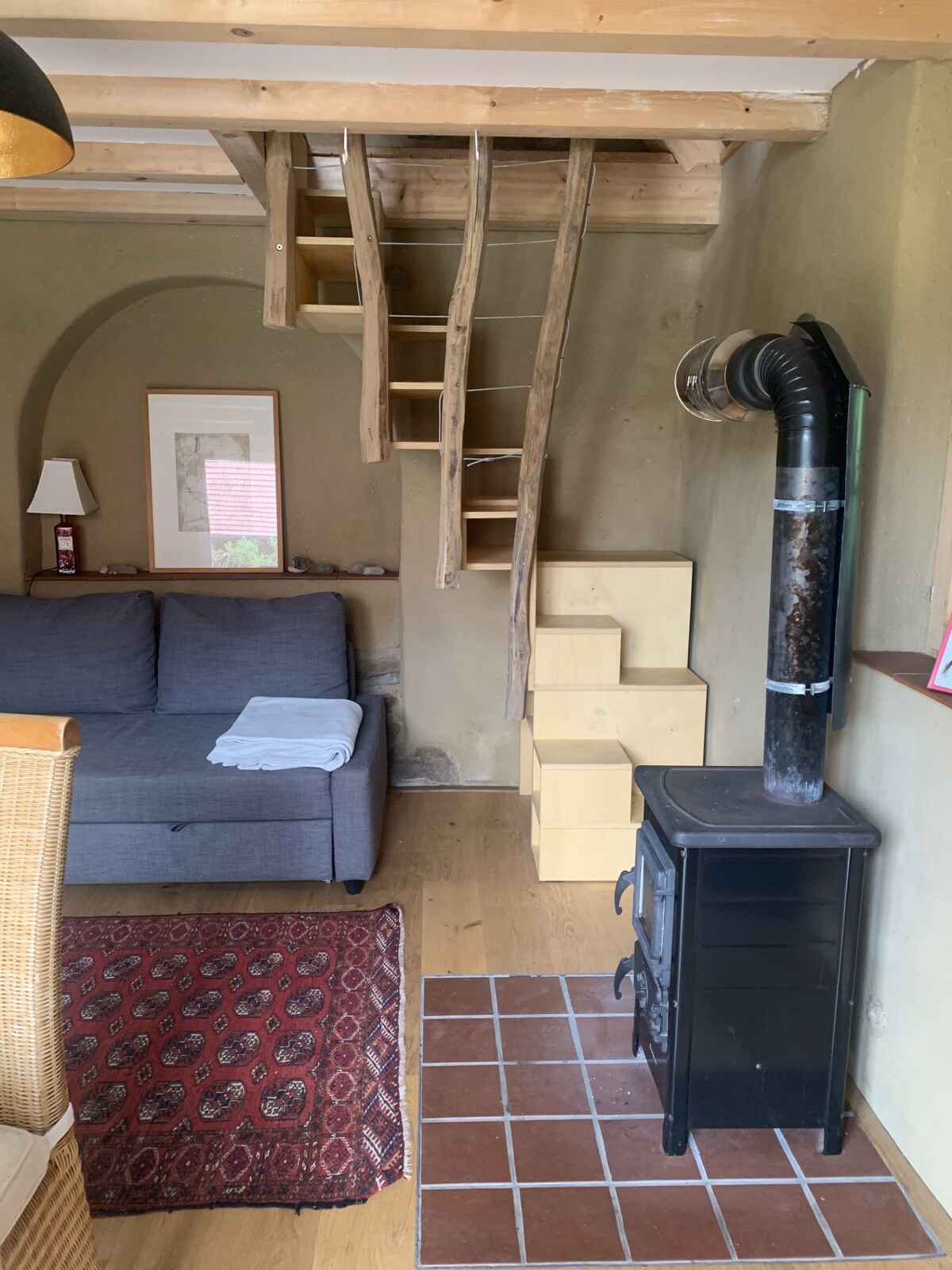 Schlafzimmer in japanischem Stil: feste Matratze 160x200 cm auf Tatami-Matten (ohne Lattenrost), die auf einem 35 cm erhöhten Podest liegen. Kleines Bad mit WC und Dusche, komplett eingerichtete Küche mit Gasherd und Backofen (ohne Spülmaschine, keine Mikrowelle), Wohnzimmer mit Sofa, schnelles WiFi/WLAN, kleiner Fernseher, Terrasse mit Tisch und Stühlen. Liegestühle im Garten dürfen mitbenutzt werden. Für kleine Gäste: Babynest oder Matratze zum Anlegen, Hochstuhl, etc. siehe Bilder im Inserat.