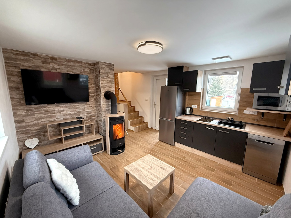 Large Chalet with 2 bedrooms + alcove with 2 bathrooms and WC, a large living room with fireplace, an equipped kitchen, a sauna and shower area. Outside, a sheltered patio, parking, a playground and a barbecue as well as a wooden terrace with Jacuzzi, lounge and deckchairs. Baby bed (60x120) on request for 250czk/night Small pets are allowed except in rooms with a supplement of 2000czk/stay + Deposit 5000czk (to be paid on site)