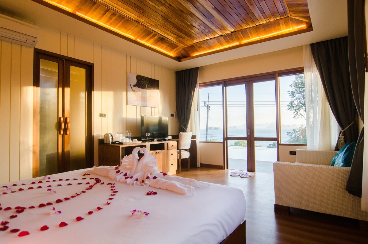 The Suite Deluxe features a double bed, a bathroom and a balcony. Enjoy a panoramic view of the Andaman Ocean dotted with islands unobstructed by other rooms. The bathroom is equipped with a rain shower and toiletries. Each room is supplied with bathrobes, wooden coffee table, couch, TV and Wi-Fi connection.
