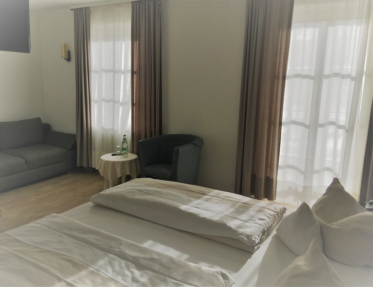 Unsere ruhig gelegenen Komfort-Zimmer bieten moderne, stilvolle Einrichtung mit komfortablem Bett, geräumigem Kleiderschrank und funktionalem Schreibtisch. Für Unterhaltung sorgt ein Flachbildfernseher mit Sat-TV, der französische Balkon bietet frische Luft und Ausblick. Das Bad verfügt über ebenerdige Dusche, WC und Föhn. Allergikerfreundlich, keine Haustiere. Kostenloses WLAN in allen Bereichen.