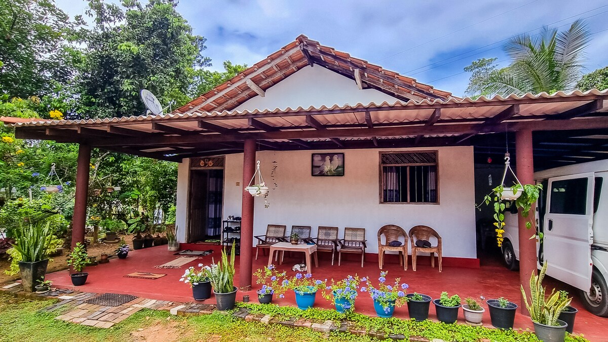 Our comfortable bedrooms all have attached bathrooms and this peaceful family house has a true village feeling! We're surrounded by the Sinharaja Rain Forest range of mountains. The Gin river is flowing behind us and the paddy fields in front of the house give you a cool natural feeling. You can enjoy delicious Sinhala meals cooked especially for you. There is a beautiful waterfall you can walk to close by which is a lovely evening walk and the area around us is full of bird song and wildlife.