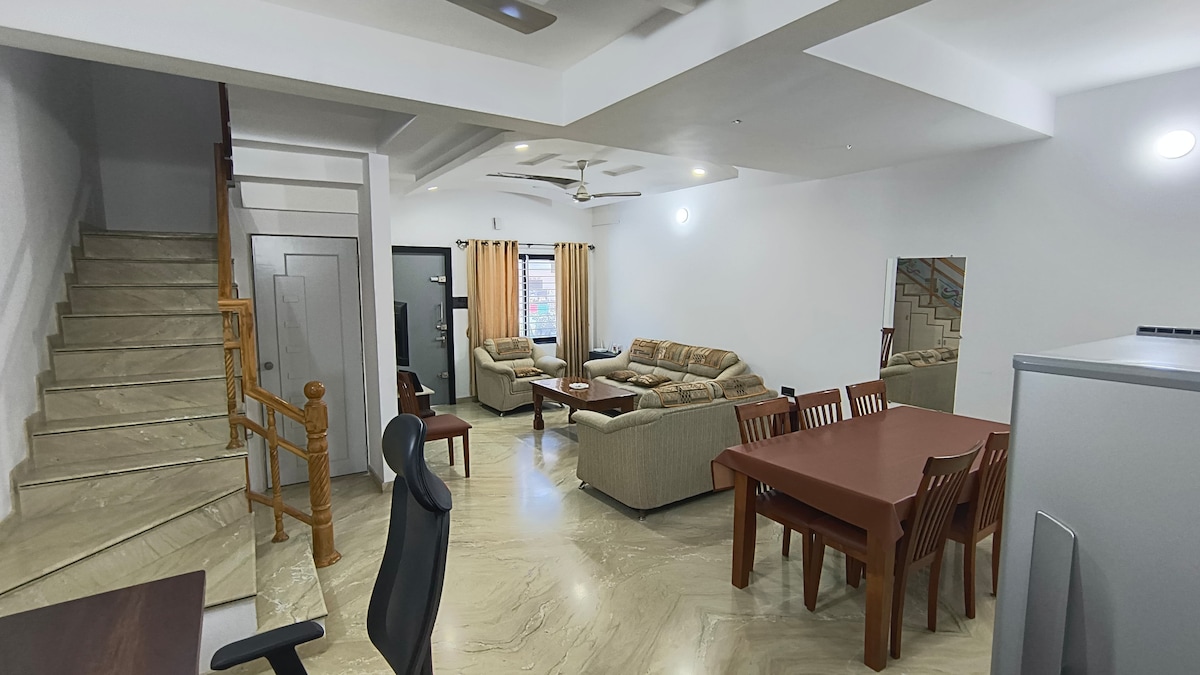 Uživajte u ovoj zadivljujućoj trospratnoj pametnoj kući s 4 spavaće sobe u prestižnom kvartu u kojem borave ministri i doktori. Posebnosti smještaja - Četiri spavaće sobe, svaka s privatnim kupatilom Potpuno opremljene kuhinje na svakom spratu, opremljene posudama OLED televizori od 65″ i 55″ za višed gledanje Upravljanje pametnim domom s omogućenim Wi-Fi mrežom Atrakcije u blizini - Atal Sarovar – 10 min Muzej Rotary Dolls – 7 min Zabavni svijet – 7 minuta Park Ishwariya – 15 min Željeznička stanica Rajkot – 15 min Glavna autobuska stanica – 10 min
