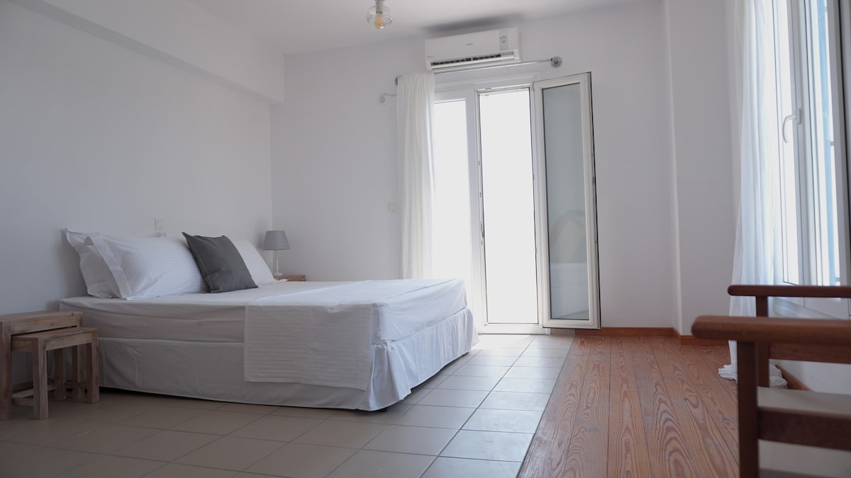 Πέτρινη σουίτα 10 μόλις μέτρα από την παραλία . Πολύ μεγάλα παράθυρα για να απολαμβάνετε την θέα Θάλασσα , εξωτερική πέργκολα με καθιστικό και τραπέζι . Πλήρη επιπλωμένη κουζίνα και άνετο μπάνιo/ντουζιέρα. Καθώς ανεβαίνετε τα ξύλινα σκαλοπάτια φτάνετε στο υπνοδωμάτιο όπου από το οποίο μπορείτε να απολαύσετε καλύτερα τη θέα της θάλασσας. Η έντονη παρουσία του ξύλου σε συνδυασμό με το χτιστό κρεβάτι και τον καναπέ σε παραπέμπει στα αρχοντικά σπίτια των Κυκλάδων.