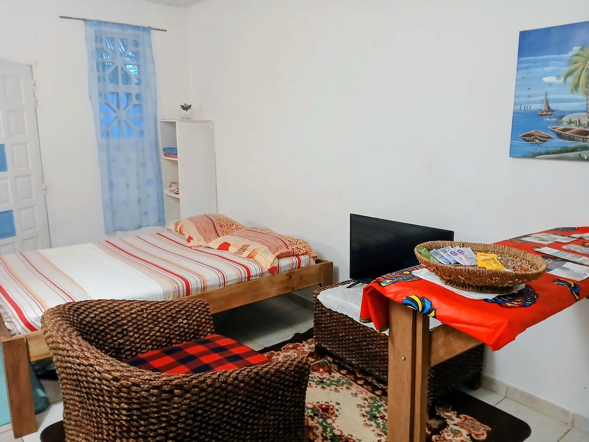 Grand studio indépendant tout équipé à 50 mètres de la plage et du front de mer de Kourou. Proche de toutes les commodités (épicerie en face du logement et plusieurs restaurants a 2 minutes a pied). Le logement comprend : 2 lits doubles, un espace salon avec canapé convertible et télévision, une cuisine tout équipée et aménagée (réfrigérateur, lave-linge, plaques de cuisson, micro-onde, bouilloire, grille-pain...) et une salle de bain indépendante.